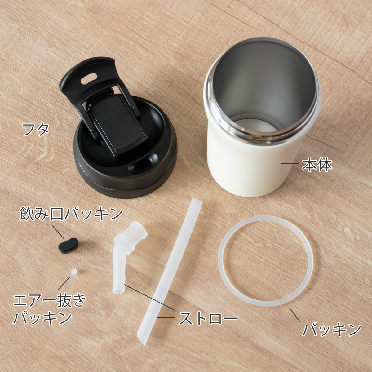 | 材質 | フタ:ポリプロピレン、飲み口(ストロー)・パッキン:シリコーンゴム、ストロー:ポリエチレン、内びん:ステンレス鋼、胴部:ステンレス鋼(アクリル塗装) |