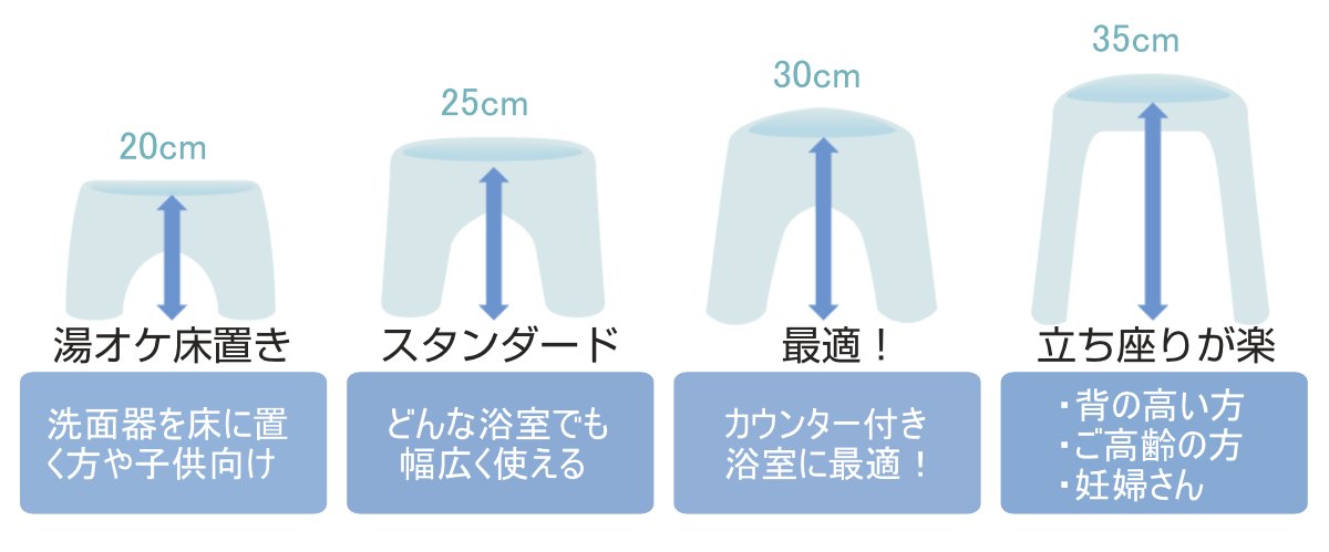 浴室カウンターの高さから「-5cm」が使いやすい風呂イスの高さ目安です。また、湯おけを床に置く方は高さ20~25cm、カウンター付き浴室の方は30cm、立ち座りを楽に行いたい方は35cm以上がおすすめです。