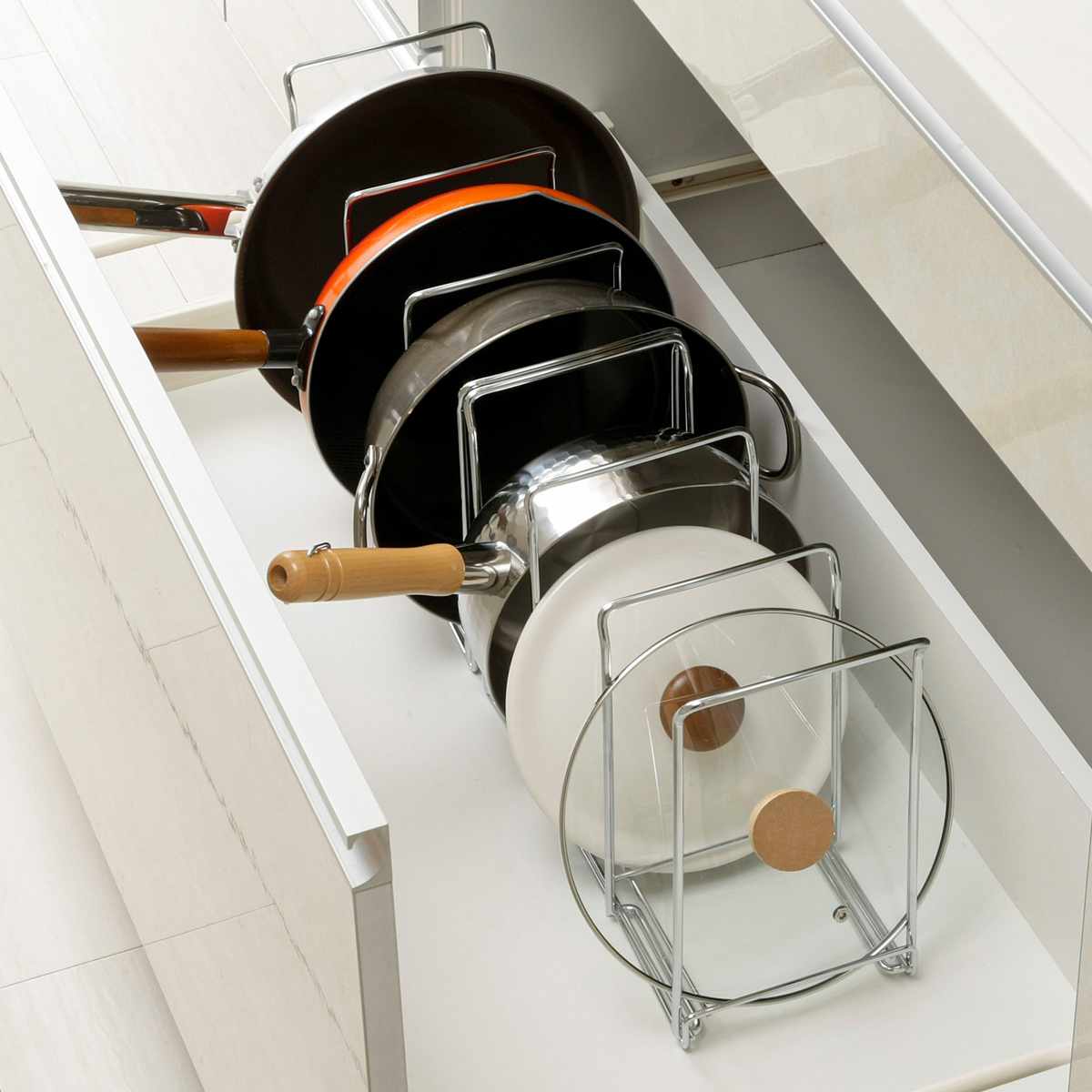 幅広の仕切りで、フライパンや鍋ぶたなど大小さまざまな調理器具を立てて整理できます。