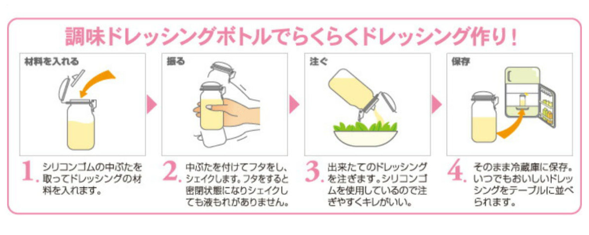 ●ドレッシング作りから、そのまま保存までできる便利なガラスボトルです。