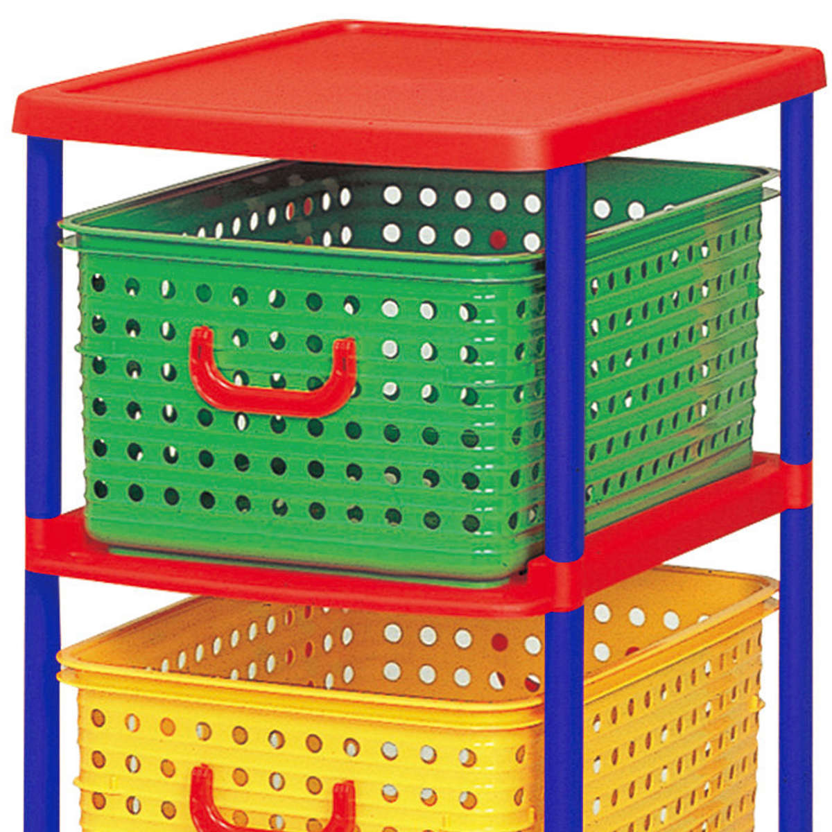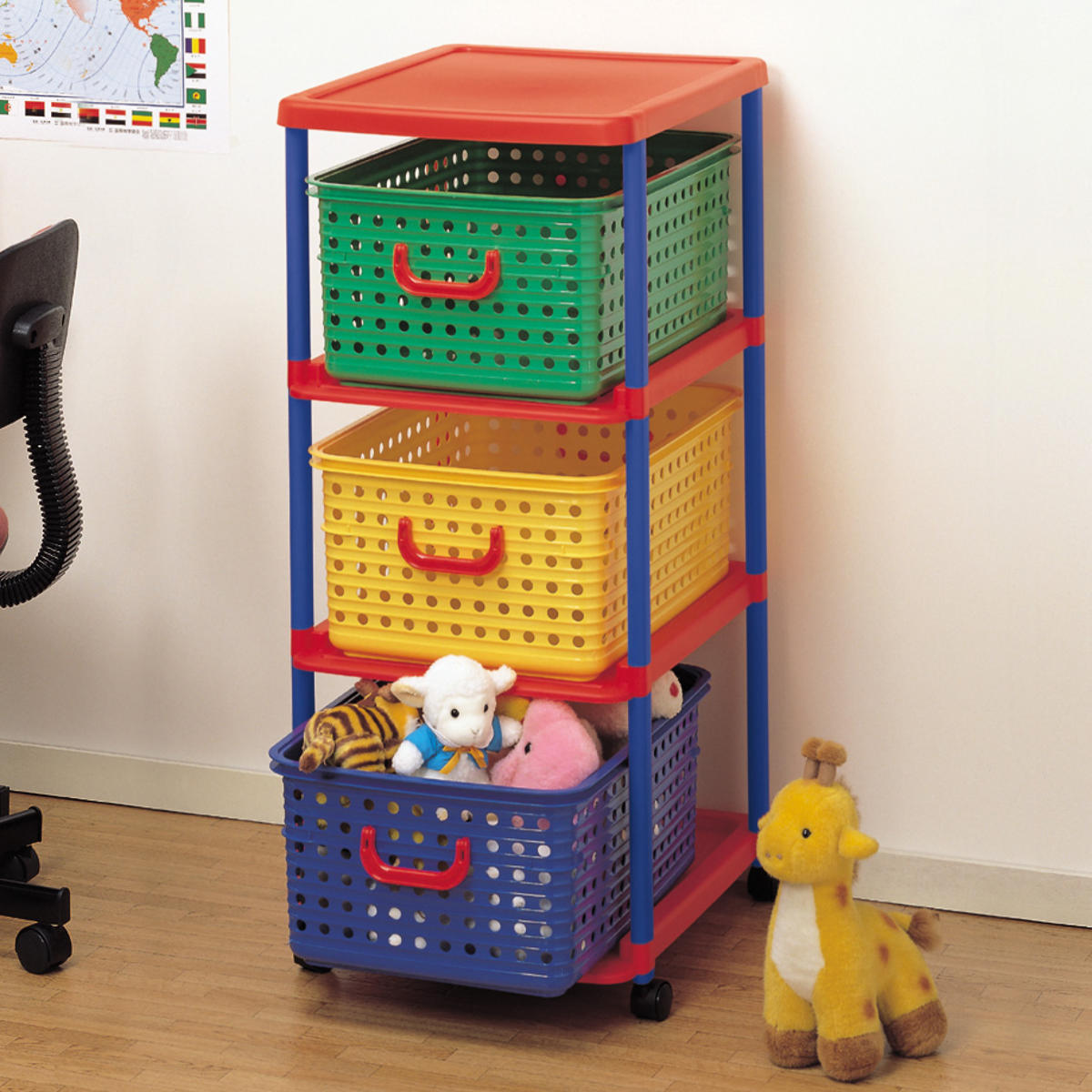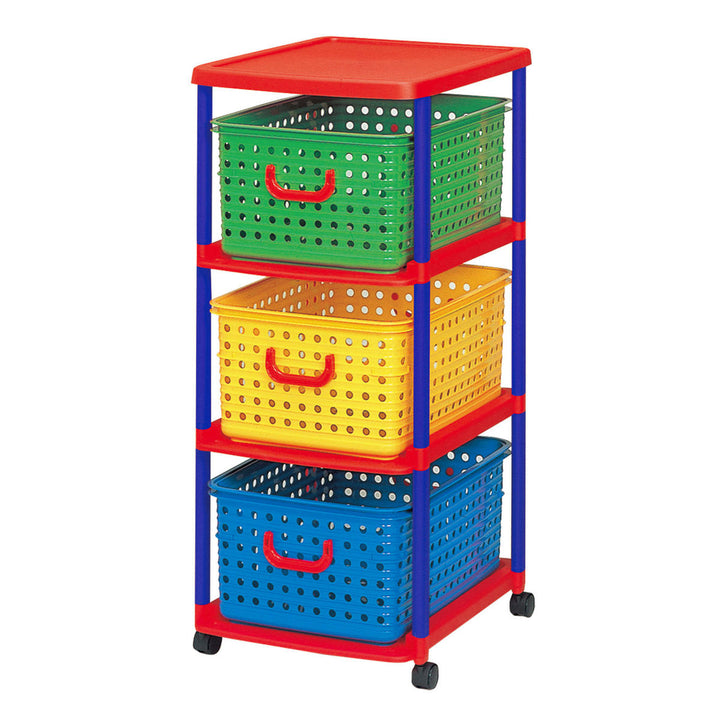 3つのカラフルなバスケットが入った3段のバスケットラックは、お子様のお片付け習慣をサポートします。色で分けて収納するものを決められるので、小さなお子様でも覚えやすく、ゲーム感覚で楽しくお片付けの習慣が身に付きます。フタのないシンプルな形状のバスケットで、お子様が自分でおもちゃを片付けやすくなっています。