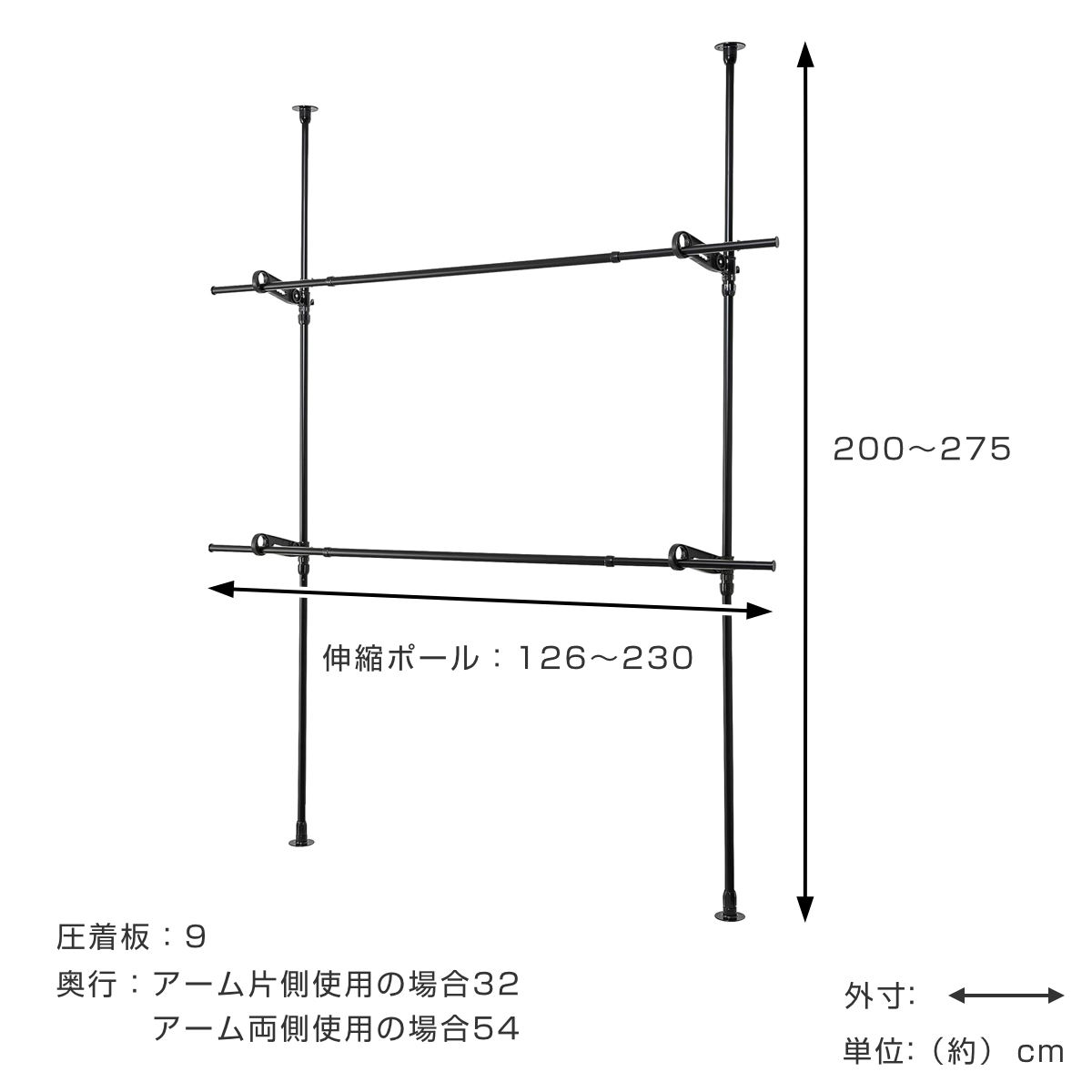 | サイズ | 本体サイズ:約 高さ200~275cm 幅:約 9cm(圧着板) 奥行:アーム片側使用の場合:約 32cm、アーム両側使用の場合:約 54cm 伸縮ポール:約 126~230cm |