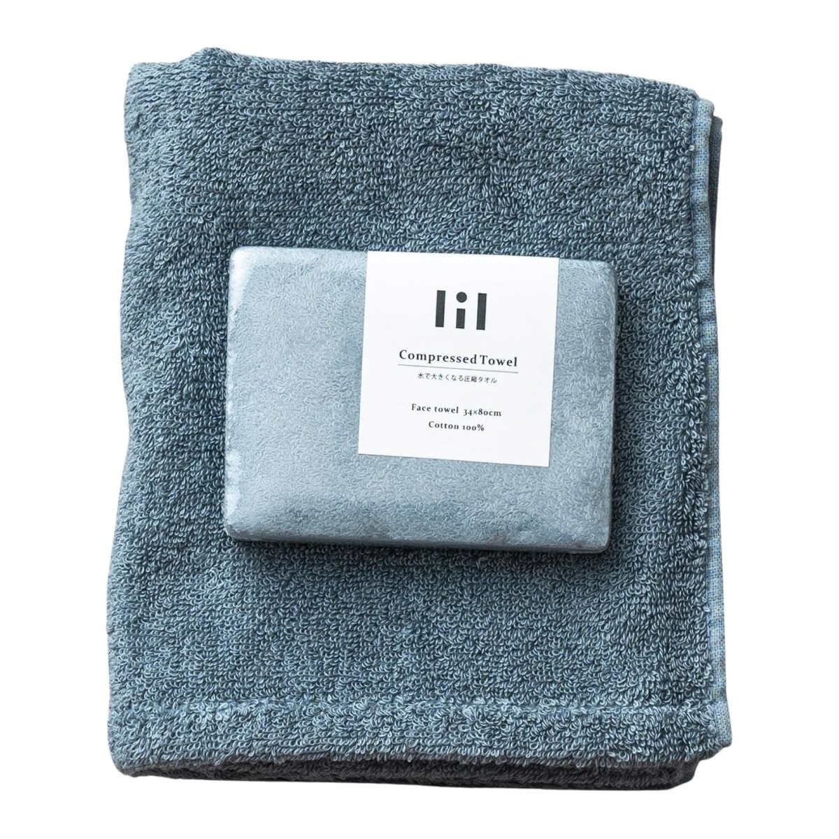 驚くほどコンパクトな圧縮タオル、「lil(リル)」のフェイスタオルです。手のひらサイズなので保管スペースも取らず、携帯性に優れているため、アウトドアや防災グッズとしても活躍します。