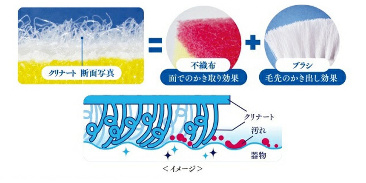 起毛のかき出し効果で汚れを落とすクリナートのキッチンスポンジです。不織布ではなく起毛タイプで研磨粒子が入っていないので、食器などに傷を付けずに汚れを落とすことができます。