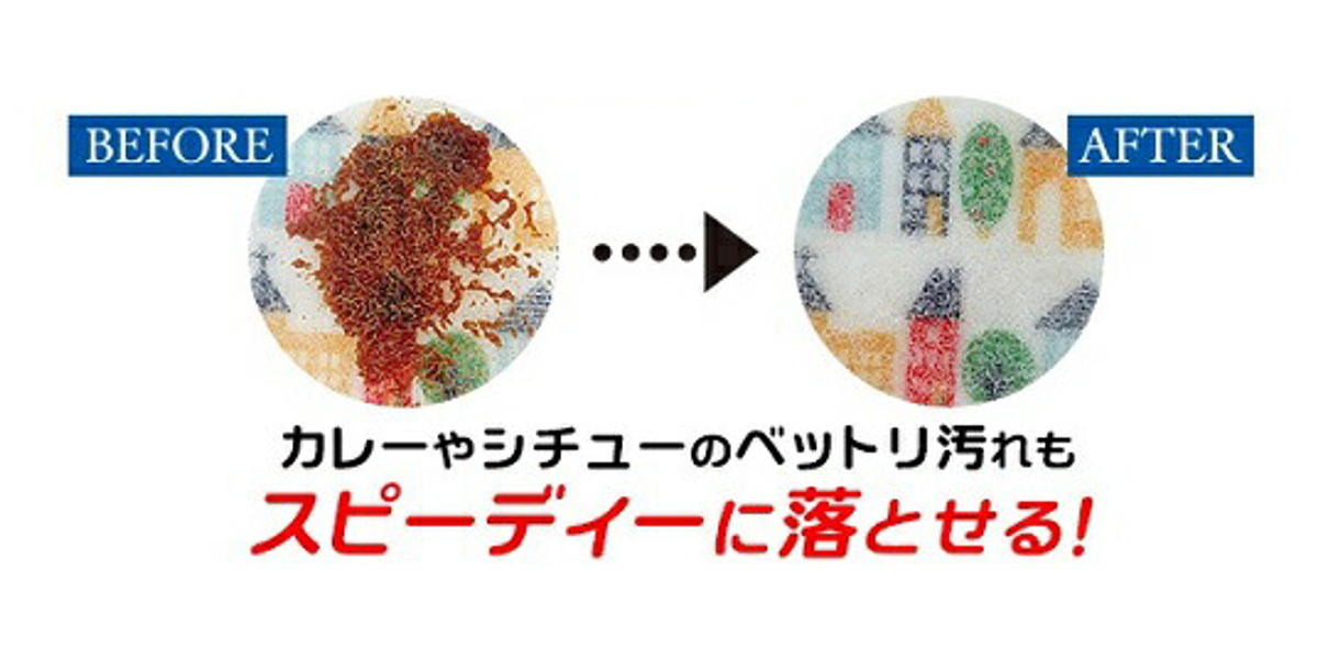 絵柄面が起毛しているため、不織布のような面でのかき取り効果と、ブラシのような毛先のかき出し効果を併せ持ち、抜群の汚れ落ちです。今まで洗いにくかった細かな溝も毛先が入って汚れを綺麗に落としてくれます。