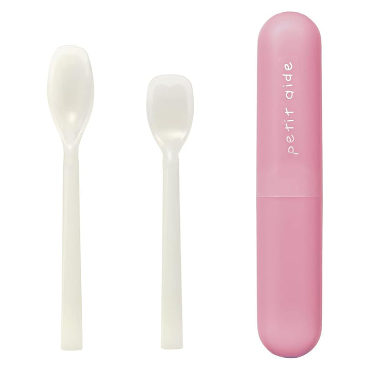やさしい口あたりで食べやすく、最後までキレイにすくえるシリコン素材でできたスプーンです。深型とヘラ型の2種類のスプーンがセットになっています。持ち運びに便利なケース付きです。