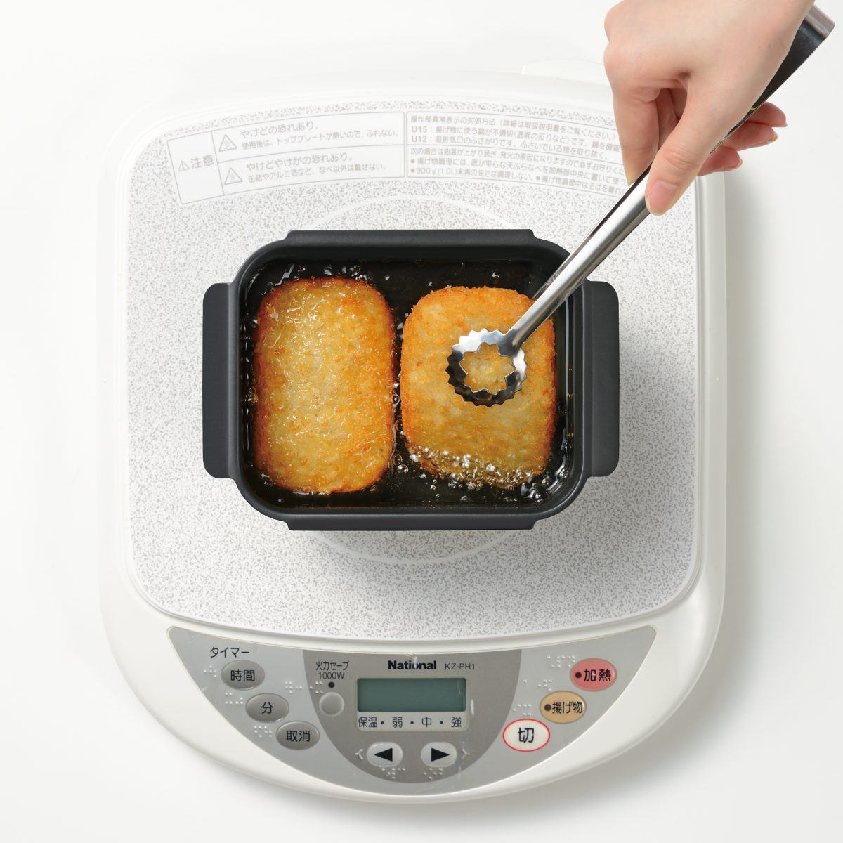 IHクッキングヒーター、ガスコンロ両用です。エビフライや唐揚げなど、1~2人分のお料理やお弁当おかず作りにぴったりなサイズです。またコンパクトなので食卓でも使いやすく、ポテトや串カツなど、揚げながら食事を楽しむのもおすすめです。