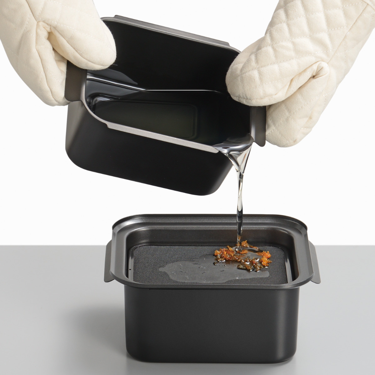 オイルポットとして使ったら、次はフライヤーとして使える1台2役のオイルターンです。保管した油を移し替えることなくそのまま火にかけられるので、揚げ物のスタンバイがスムーズ。セットの漉しアミは油切りとしても使用でき、これ1台で揚げ物調理が完結します。