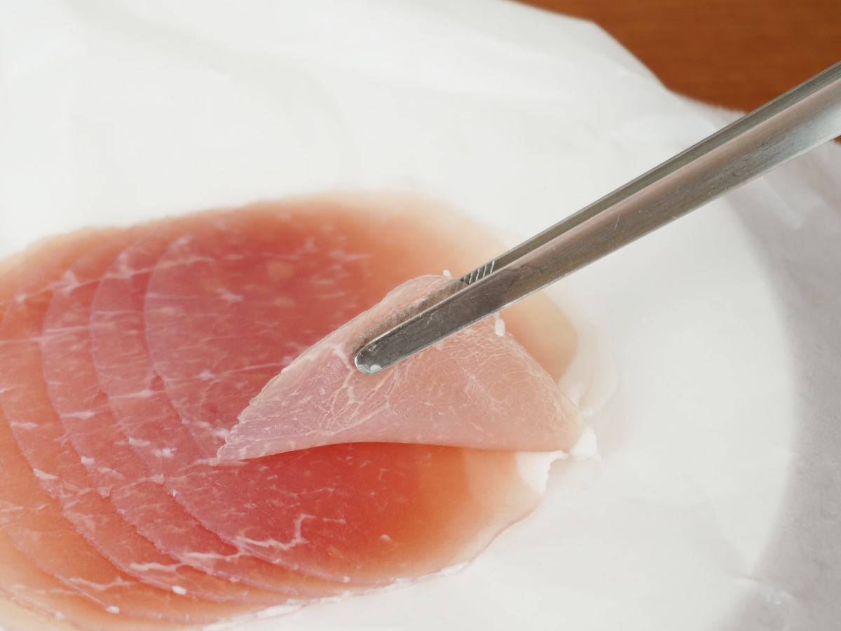 コンパクトで取り扱いやすいサイズのトングは、生ハムなどの薄い食材も先細の先端で1枚ずつ取り分けることができます。