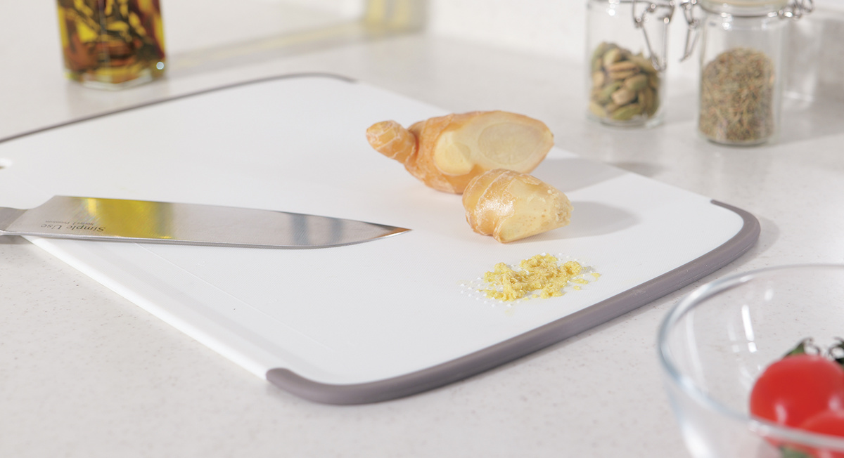まな板の縁に滑り止めが付いているので、しっかり固定されて安心です。手元が安定しスムーズに食材を切り進められます。