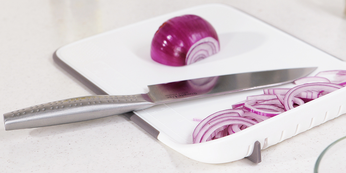 まな板の縁に滑り止めが付いているので、しっかり固定されて安心です。手元が安定しスムーズに食材を切り進められます。