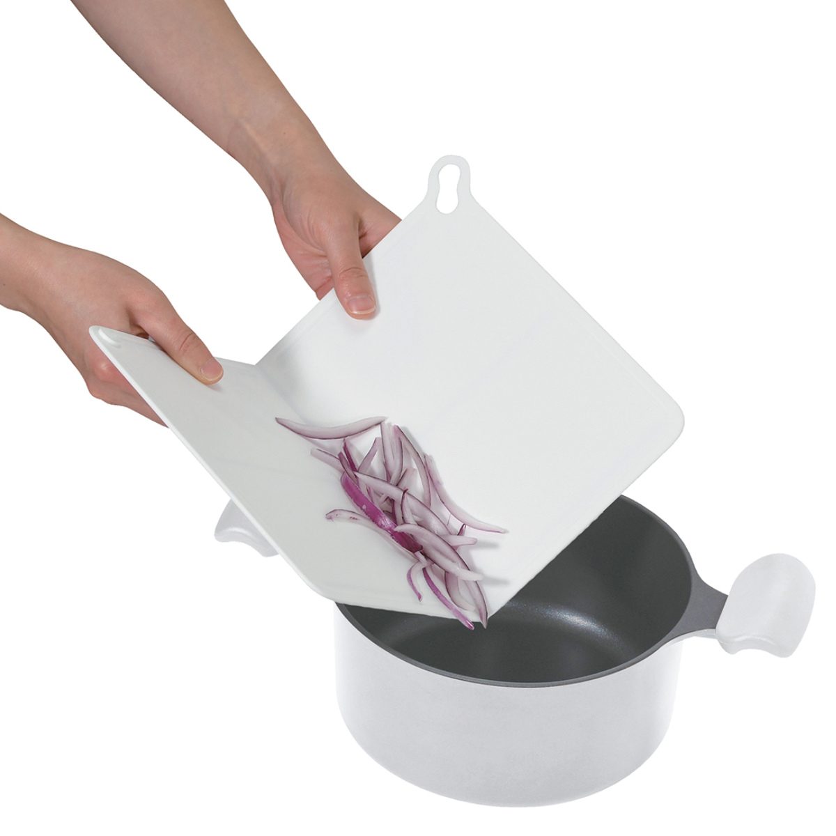 まな板をサッと折るだけで、カットした食材を鍋やボウルへスムーズに移せます。こぼれにくく、調理がスピーディーに進みます。