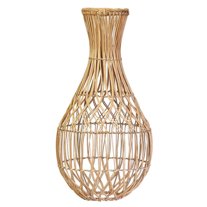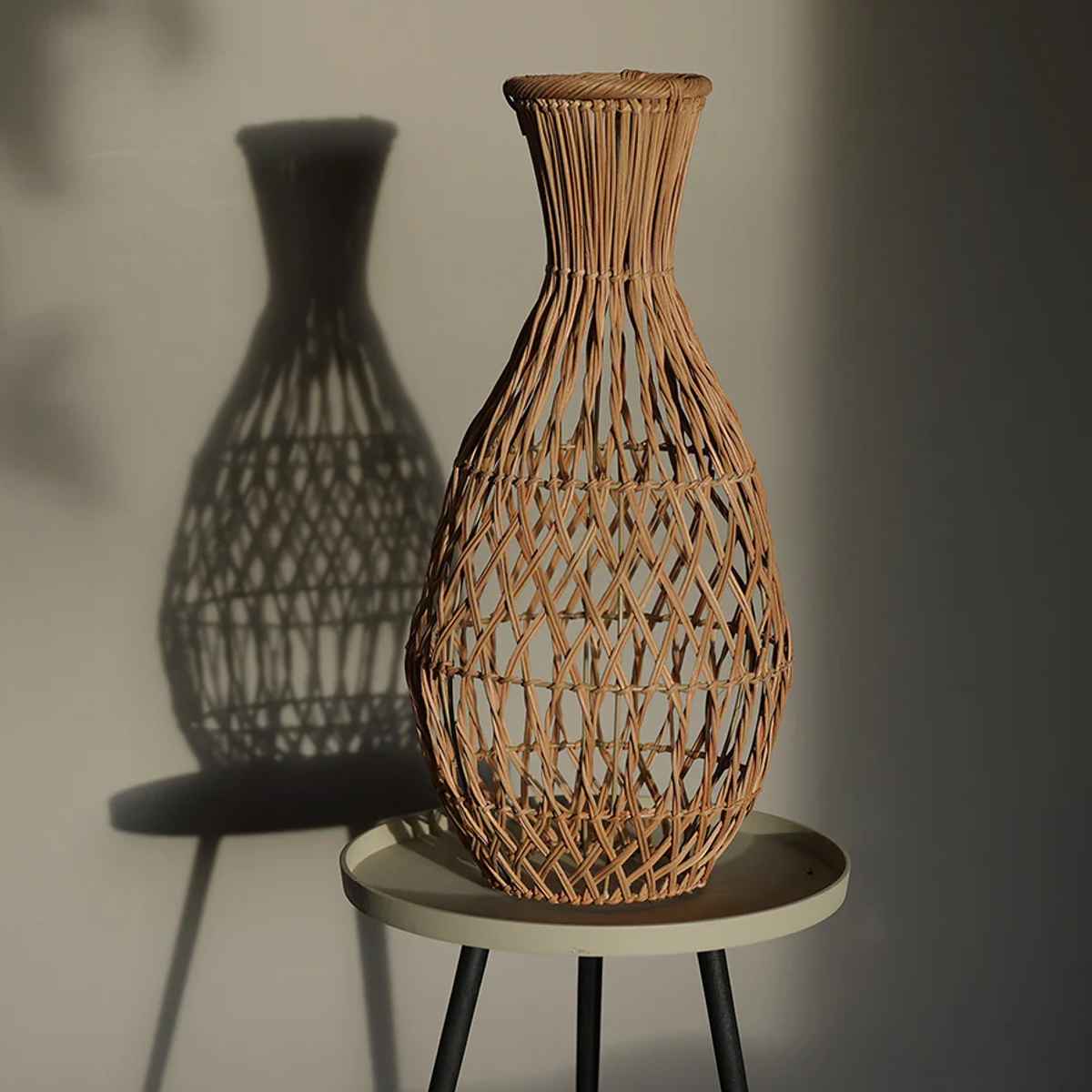 時間帯や光の角度によって変化する影の表情は、まるで自然が織りなすアートのような感動を添えてくれます。シンプルなガラスの筒も、ラタンの装飾によって温もりのあるオブジェへと昇華させます。