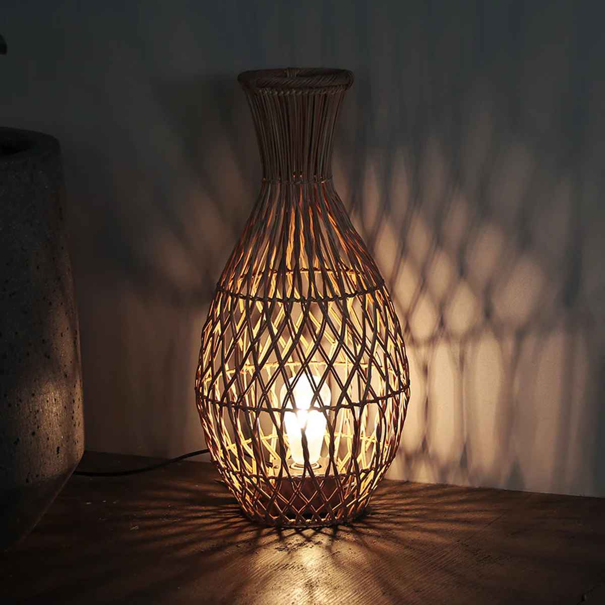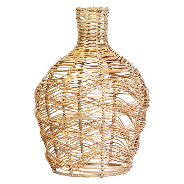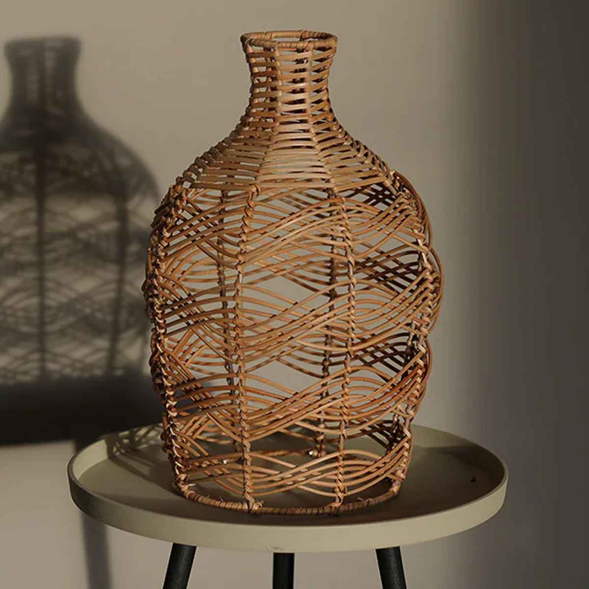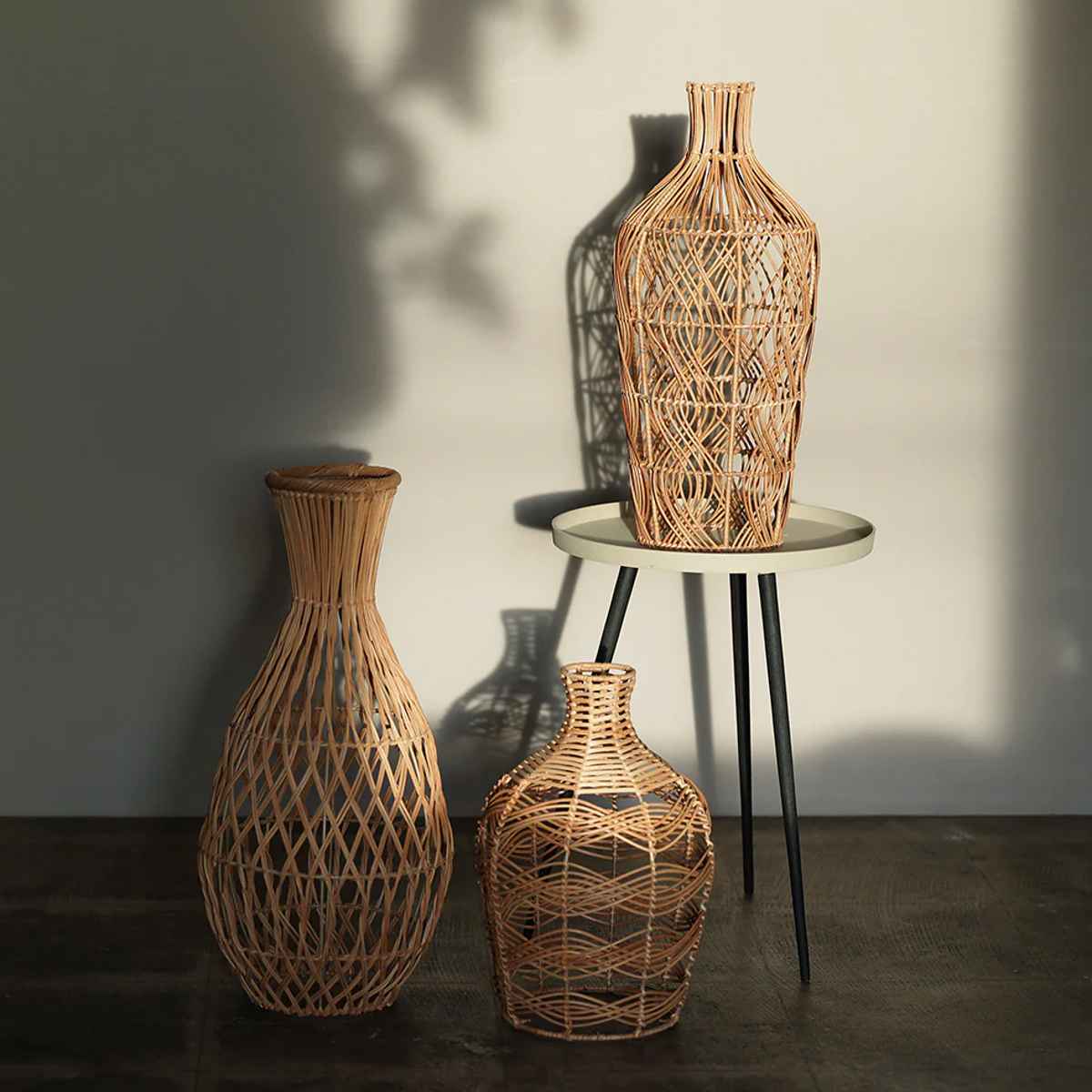 時間帯や光の角度によって変化する影の表情は、まるで自然が織りなすアートのような感動を添えてくれます。シンプルなガラスの筒も、ラタンの装飾によって温もりのあるオブジェへと昇華させます。
