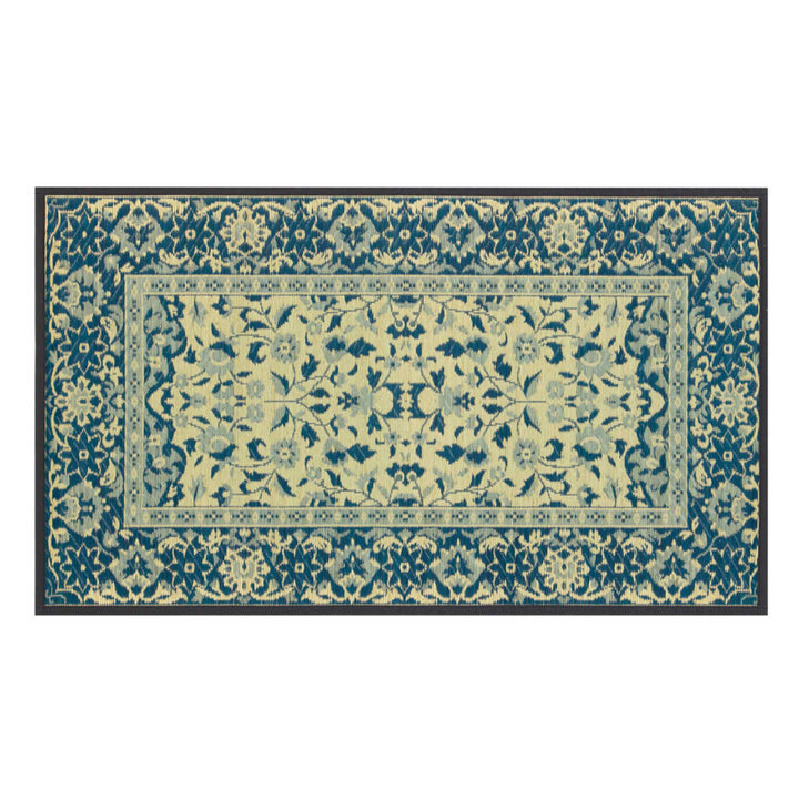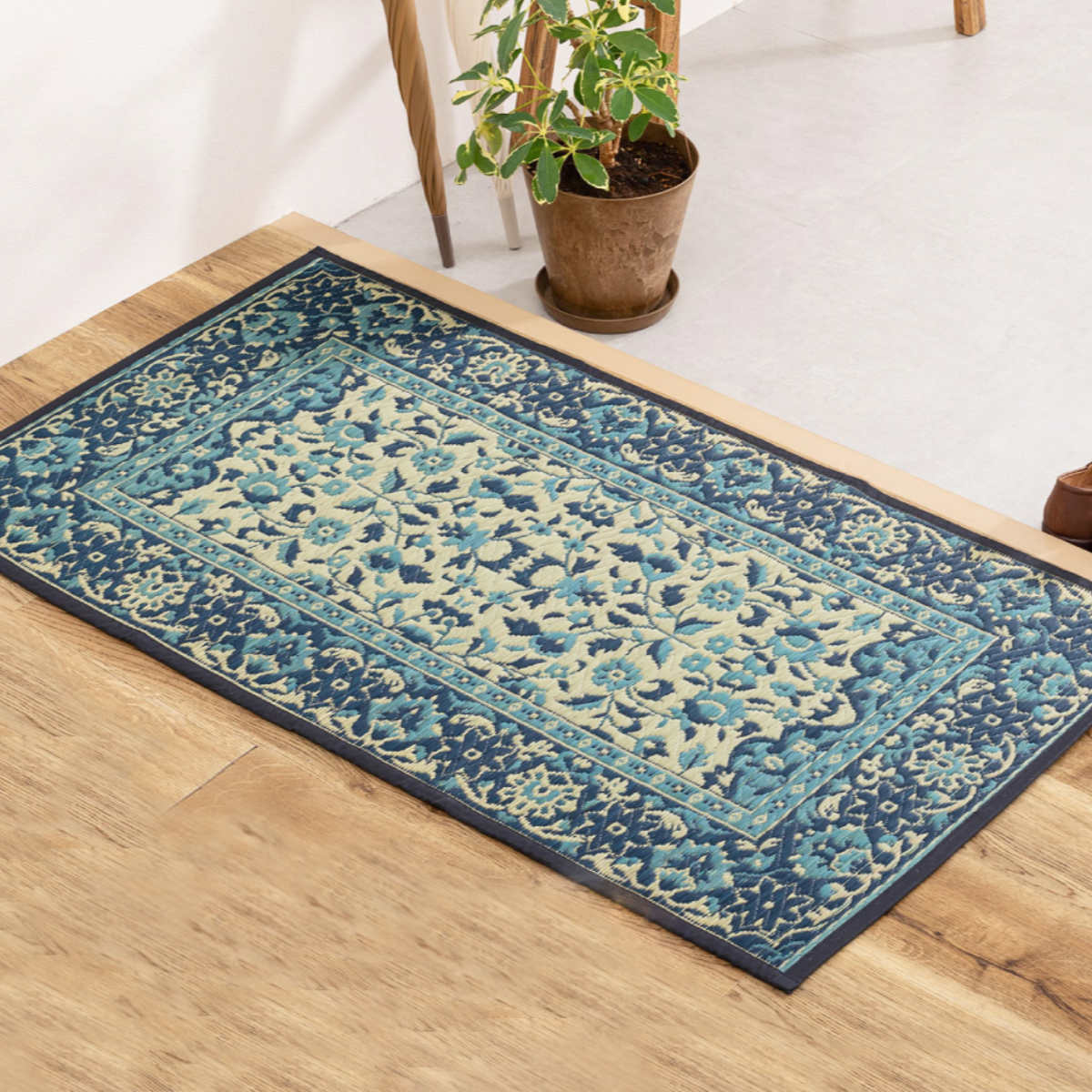 三重織でしっかりと厚みを持たせ、ペルシャ絨毯を思わせる繊細なデザインを表現した洋風い草マットです。美しく染め上げたい草を複雑に織り上げることで、気品ある模様が浮かび上がります。爽やかな花柄が玄関をエレガントに彩ります。