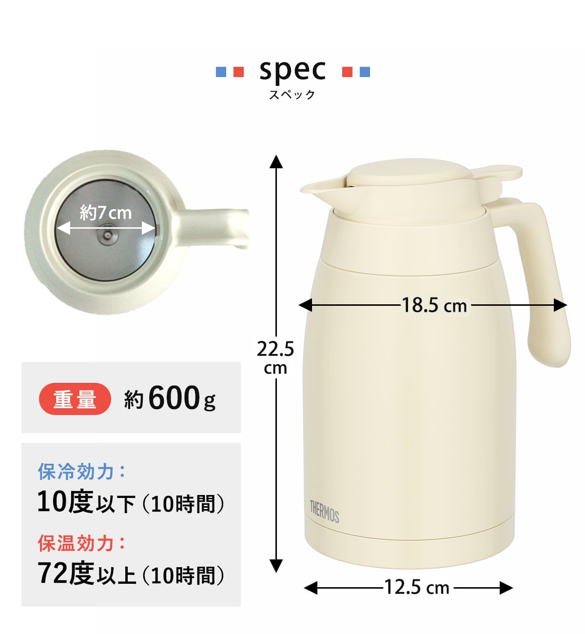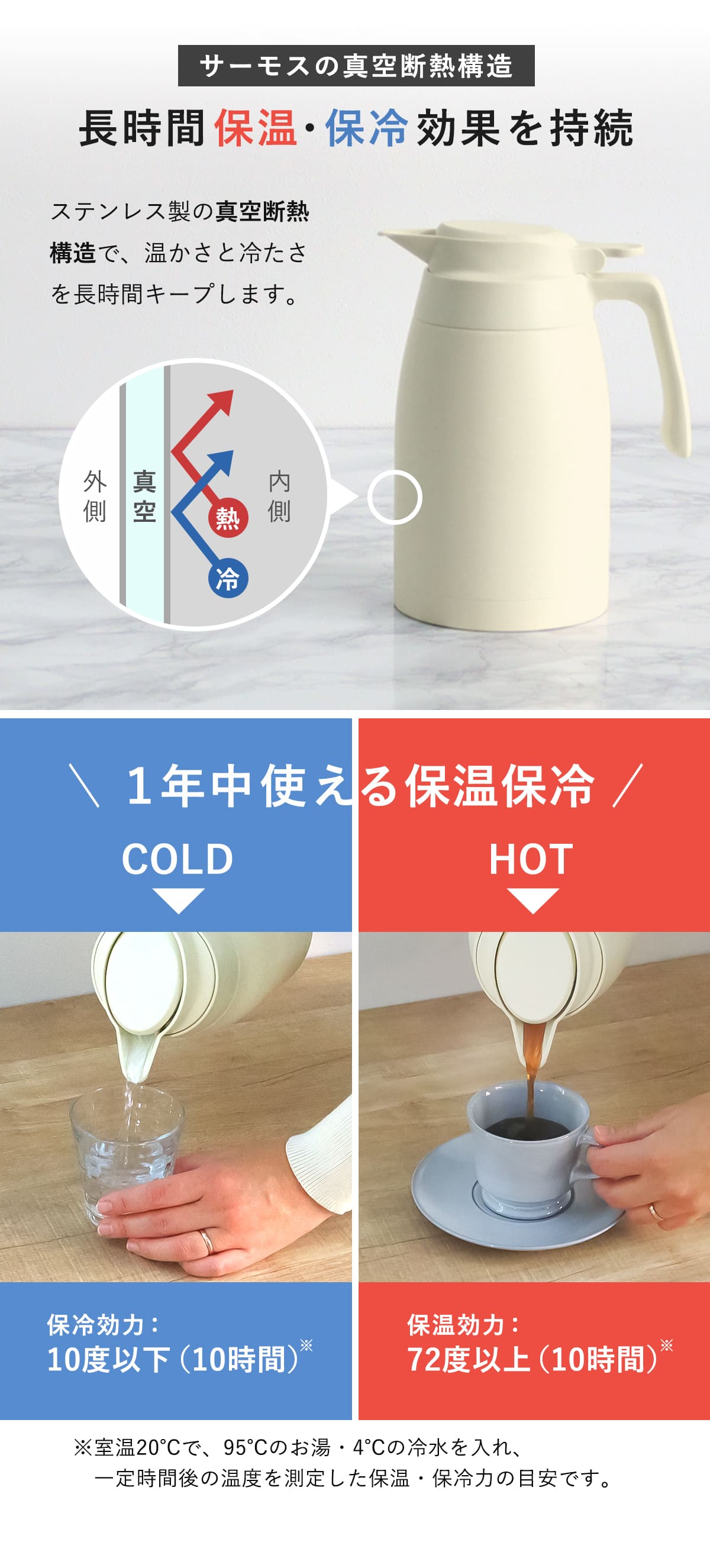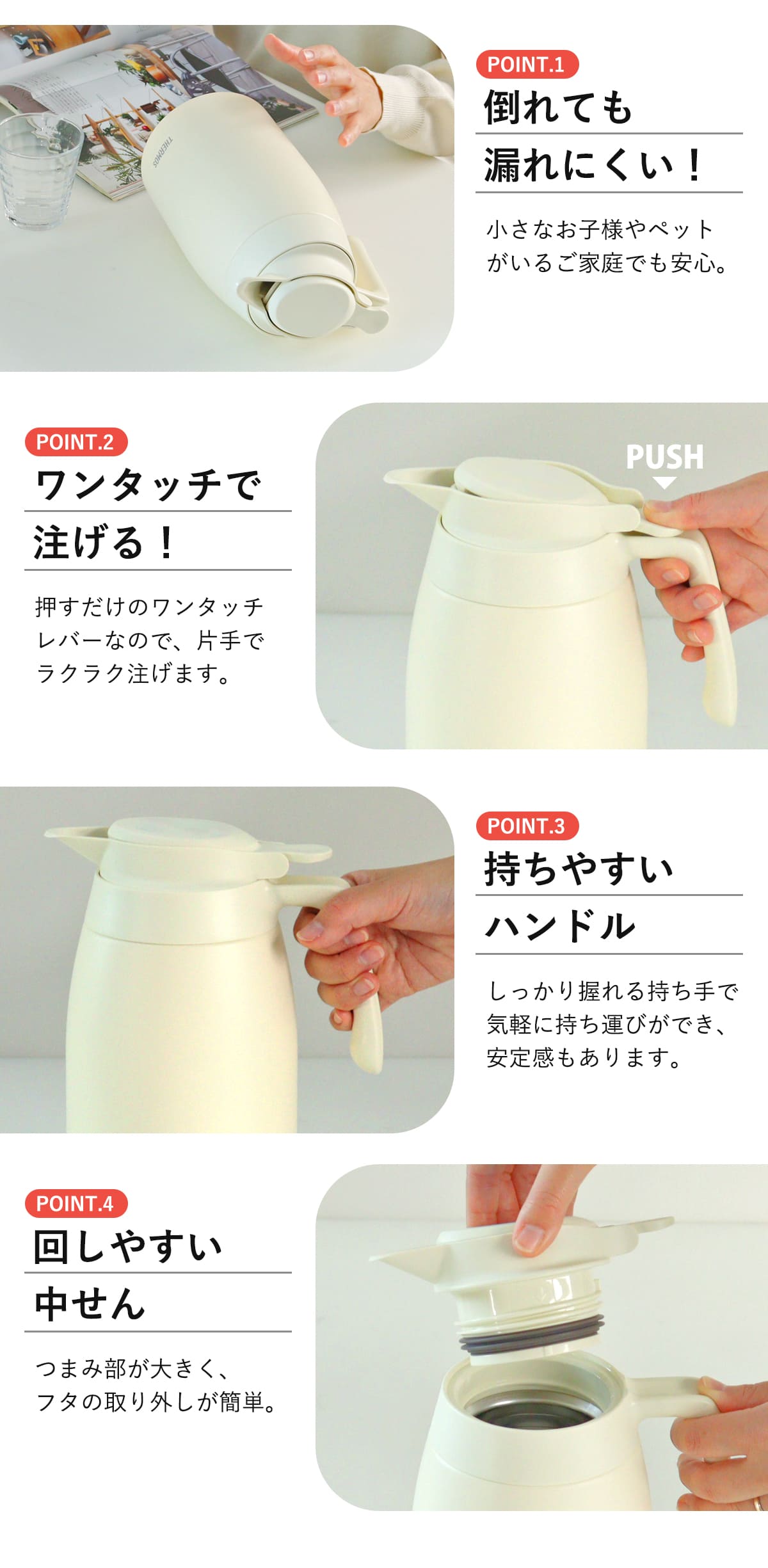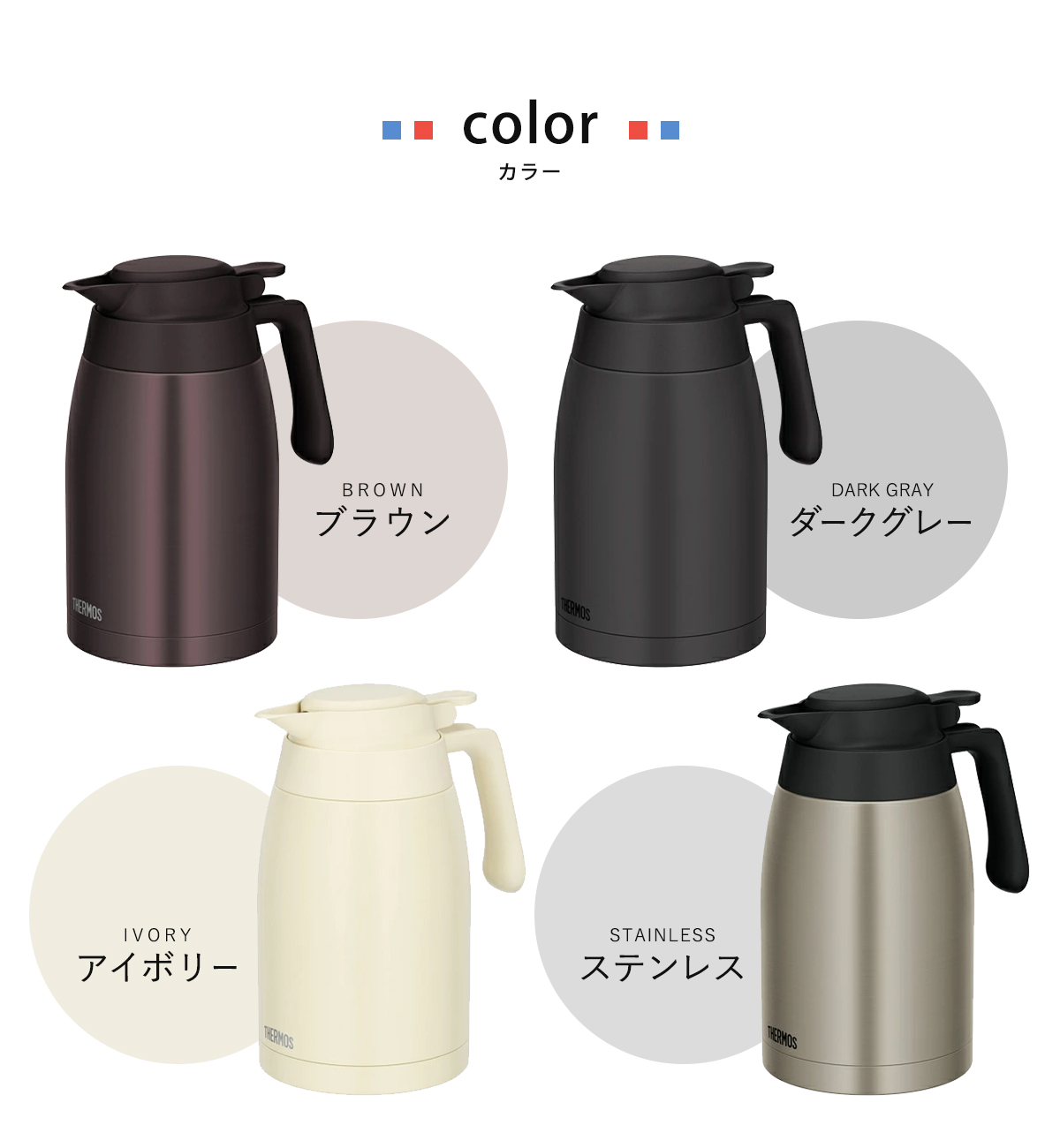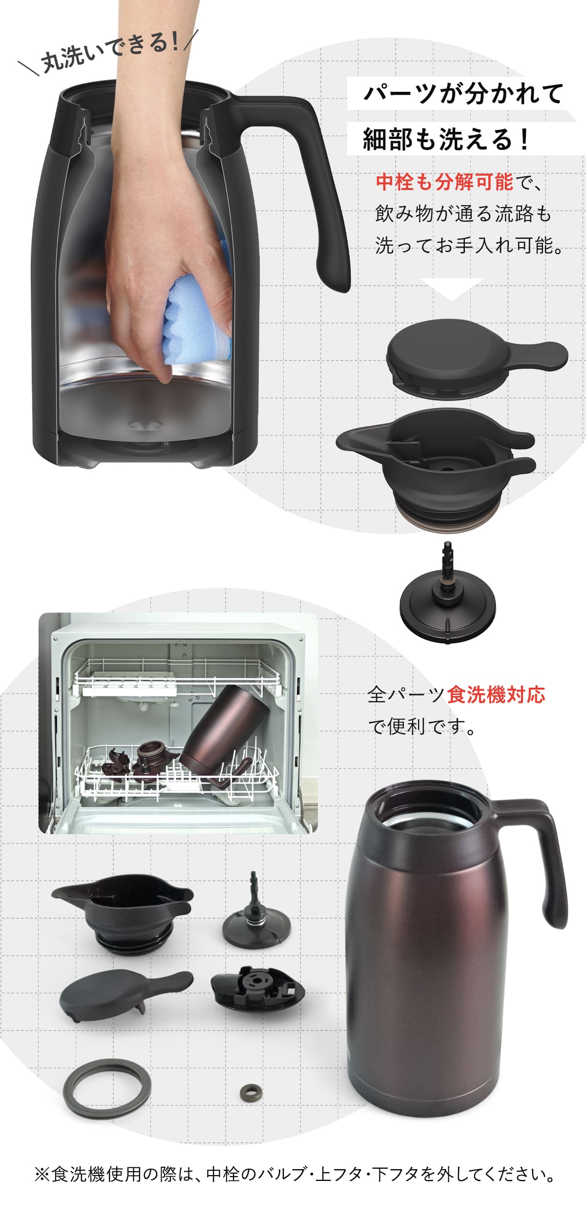 | 材質 | 内びん:ステンレス鋼 胴部:ステンレス鋼(アクリル樹脂塗装) ハンドル・上フタ・下フタ・中せん本体・バルブ:ポリプロピレン シールパッキン・ベンパッキン:シリコーンゴム |