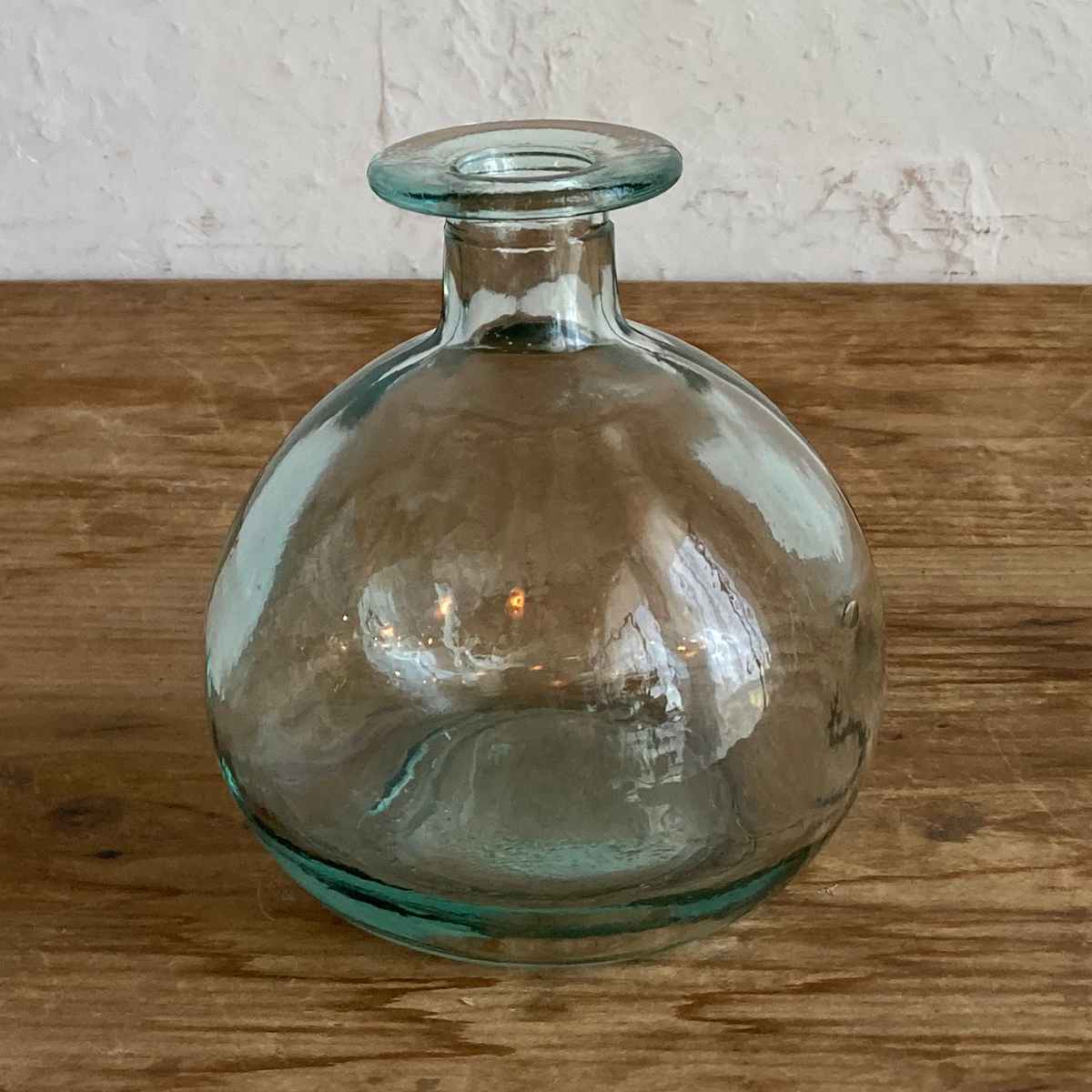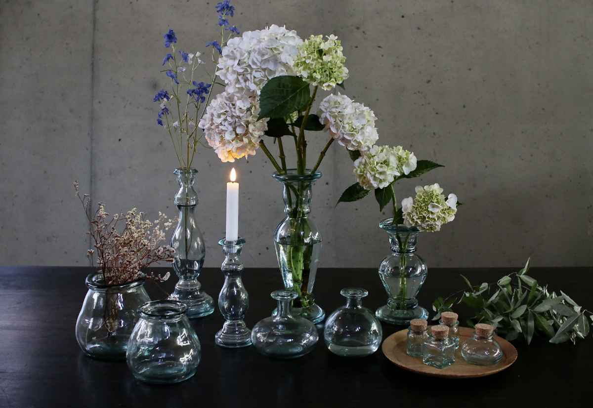 スペイン生まれのリサイクルガラスベースは、独特の揺らぎや気泡を含んでいて個性豊かな仕上がりです。窓辺やテーブルにさりげなく置くだけで、雰囲気のある空間を演出できます。