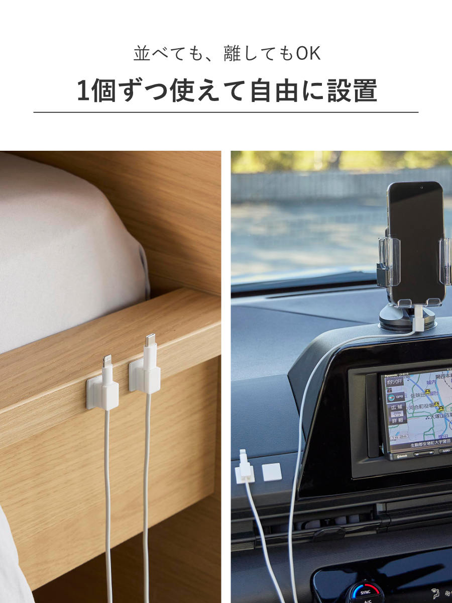 1個ずつ独立しているタイプなので、必要な数だけ取り付けられます。車内など狭いスペースにも対応でき、自由なレイアウトが可能です。ベッドサイドや車内でも、ケーブルが床に落ちず、配線がスッキリ片付きます。