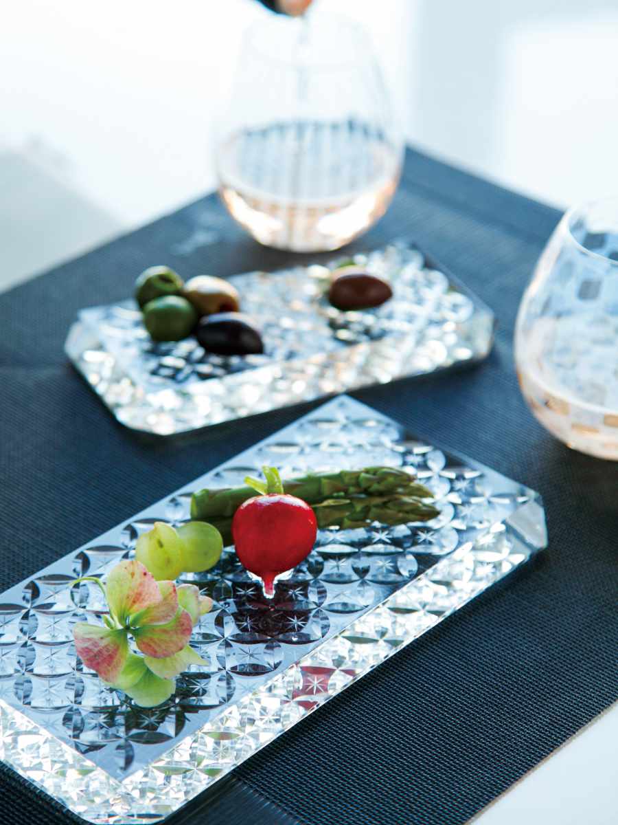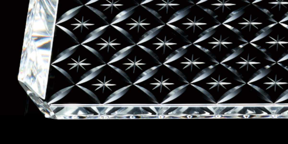 冷たく凍りつき、澄み切って鮮やかな様子を表す言葉「さゆる」。透明度と反射度の高いガラスに、多面体のフォルムと江戸切子文様が織りなす光の反射が、食材をほのかに照らし、新鮮で上品な盛り付けを演出します。