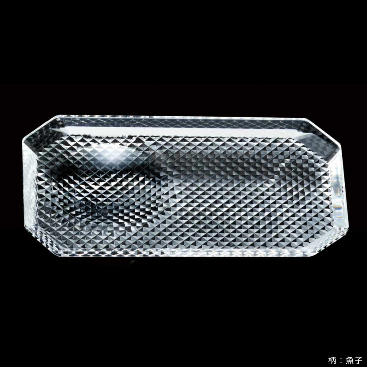 伝統技法「江戸切子」で丁寧に仕上げた、モダンで洗練されたガラスの板皿。片側には丸いくぼみがあり、醤油を注ぐスペースとして使えます。透明感の高いガラス越しに醤油の色合いも澄み渡り、料理を美しく引き立てます。食卓に凛とした存在感と華やぎを添える一枚です。