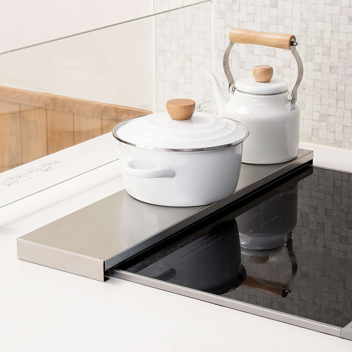 奥行のあるワイドサイズで、鍋やケトルなどの一時置きにも便利。耐荷重約5kgで安心してご使用いただけます。