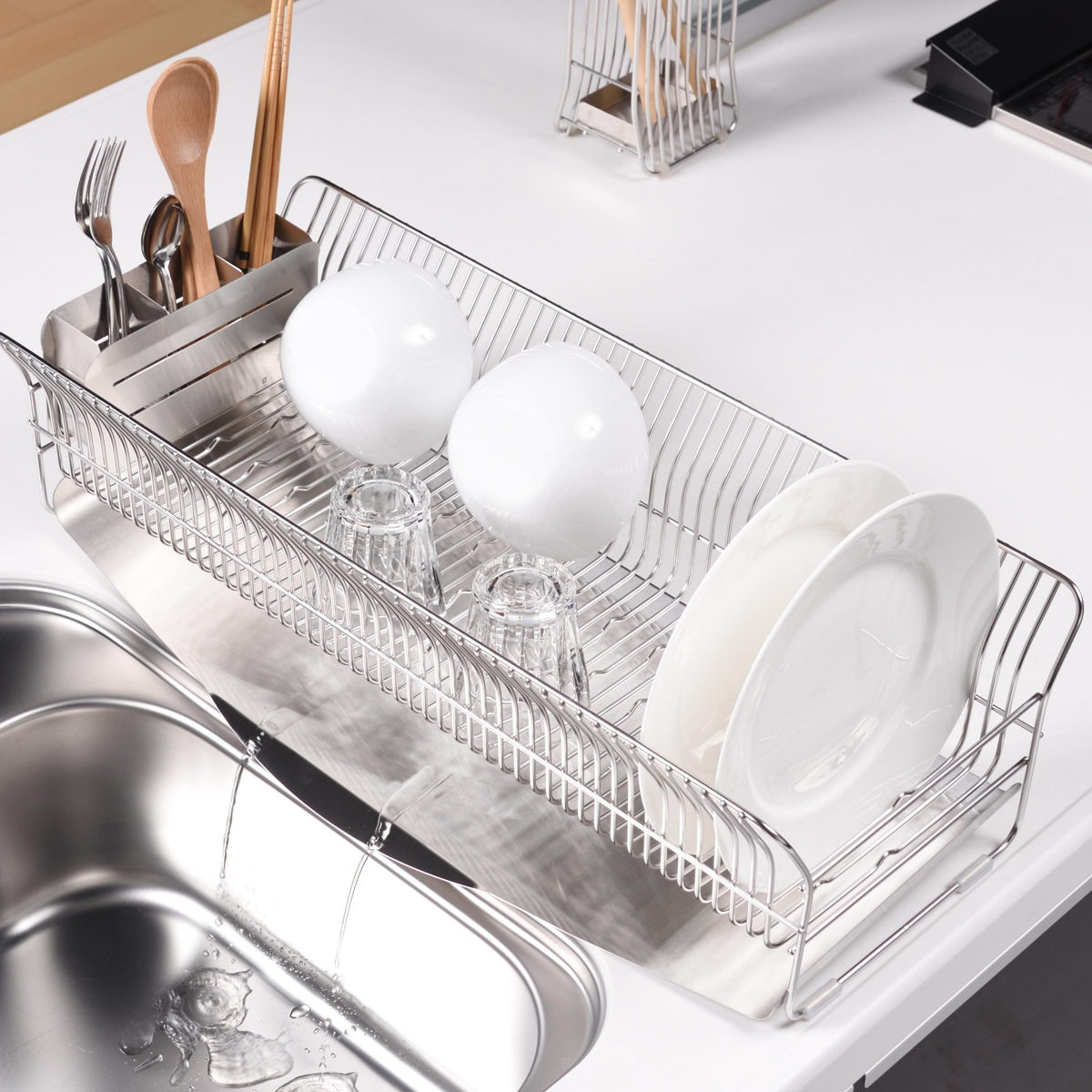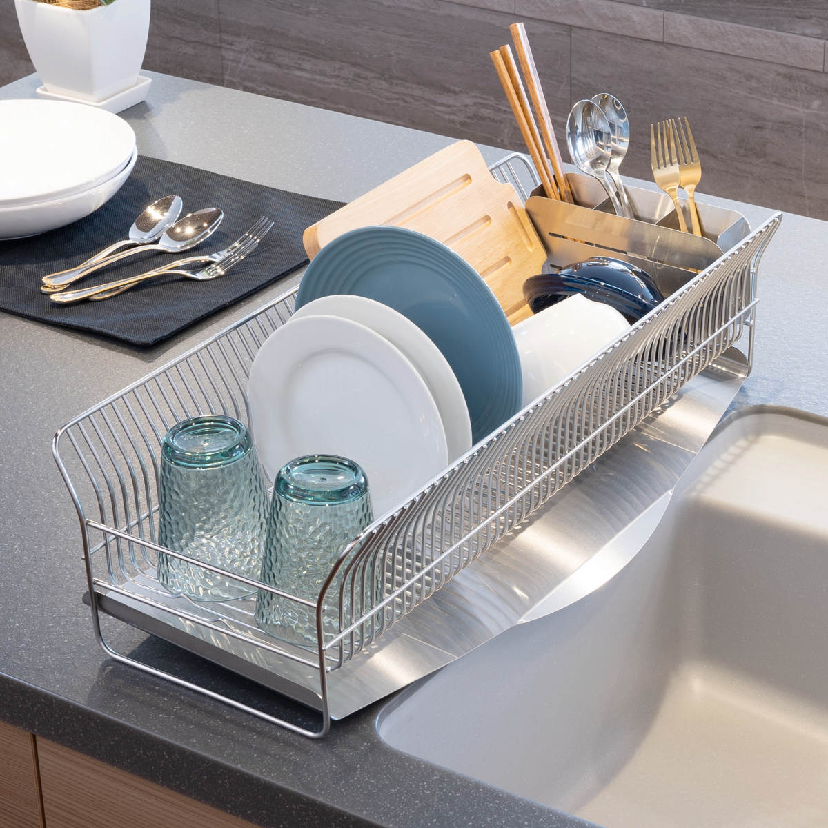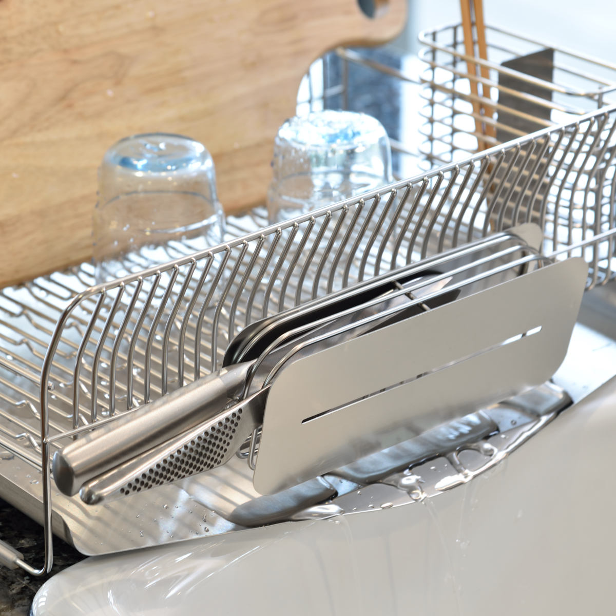 幅約24.5cmのスリムサイズで、シンクまわりの限られたスペースにもすっきり収まります。普段は食洗機を使う方も、サブの水切りラックとして気軽に活用可能。縦長タイプなので、シンクの上をまたいで設置することもできます。