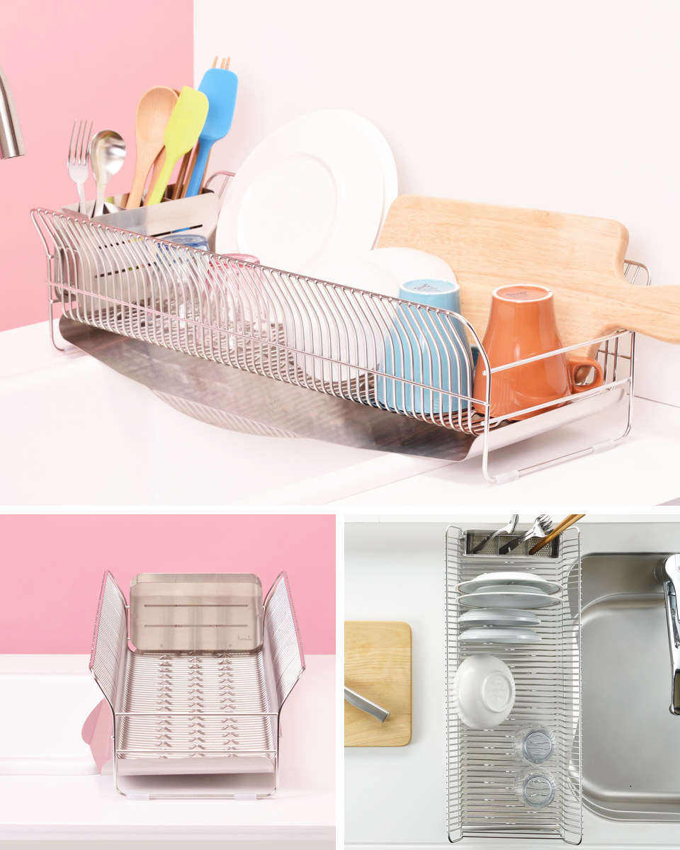 耐荷重は約10kgとスリムなのにしっかりとした収納力。縦横どちらにも効率よく食器を置けるので、大皿やお椀、重たいフライパンやまな板も水切りできます。