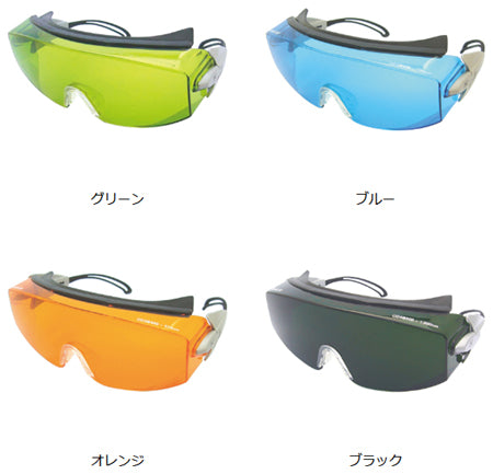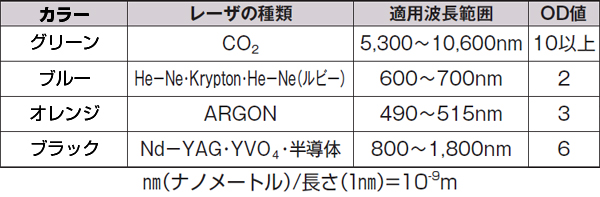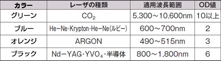 | 備考 | レーザの種類:グリーン/CO2、ブルー/HeーNE・Krypton・HeーNe(ルビー)、オレンジ/ARGON、ブラック/NdーYAG・YVO4・半導体 適用波長範囲:グリーン/5300~10600、ブルー/600~700、オレンジ/490~515、ブラック/800~1800(単位:nm) OD値:グリーン/10以上、ブルー/2、オレンジ/3、ブラック/6 |