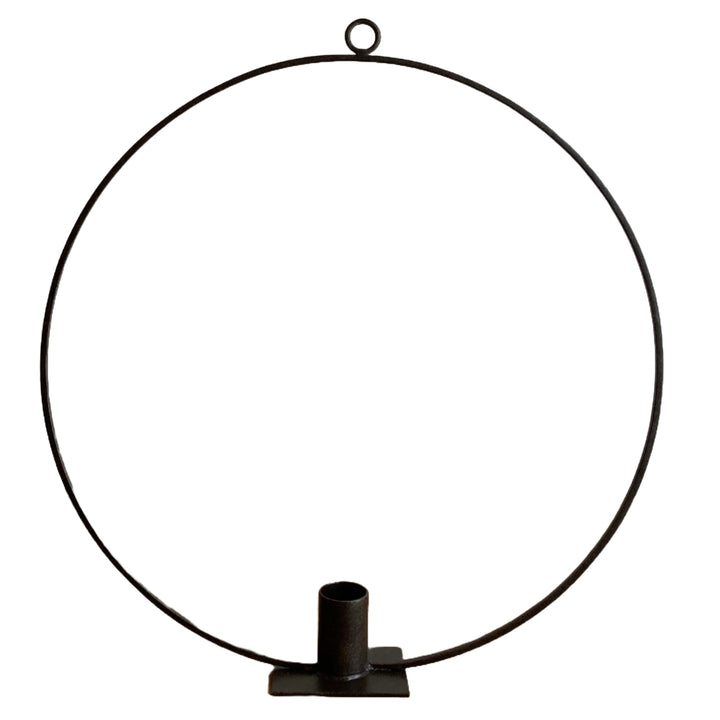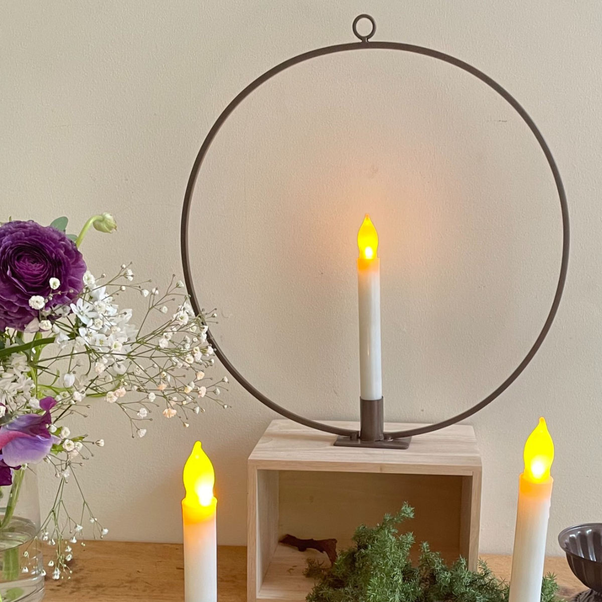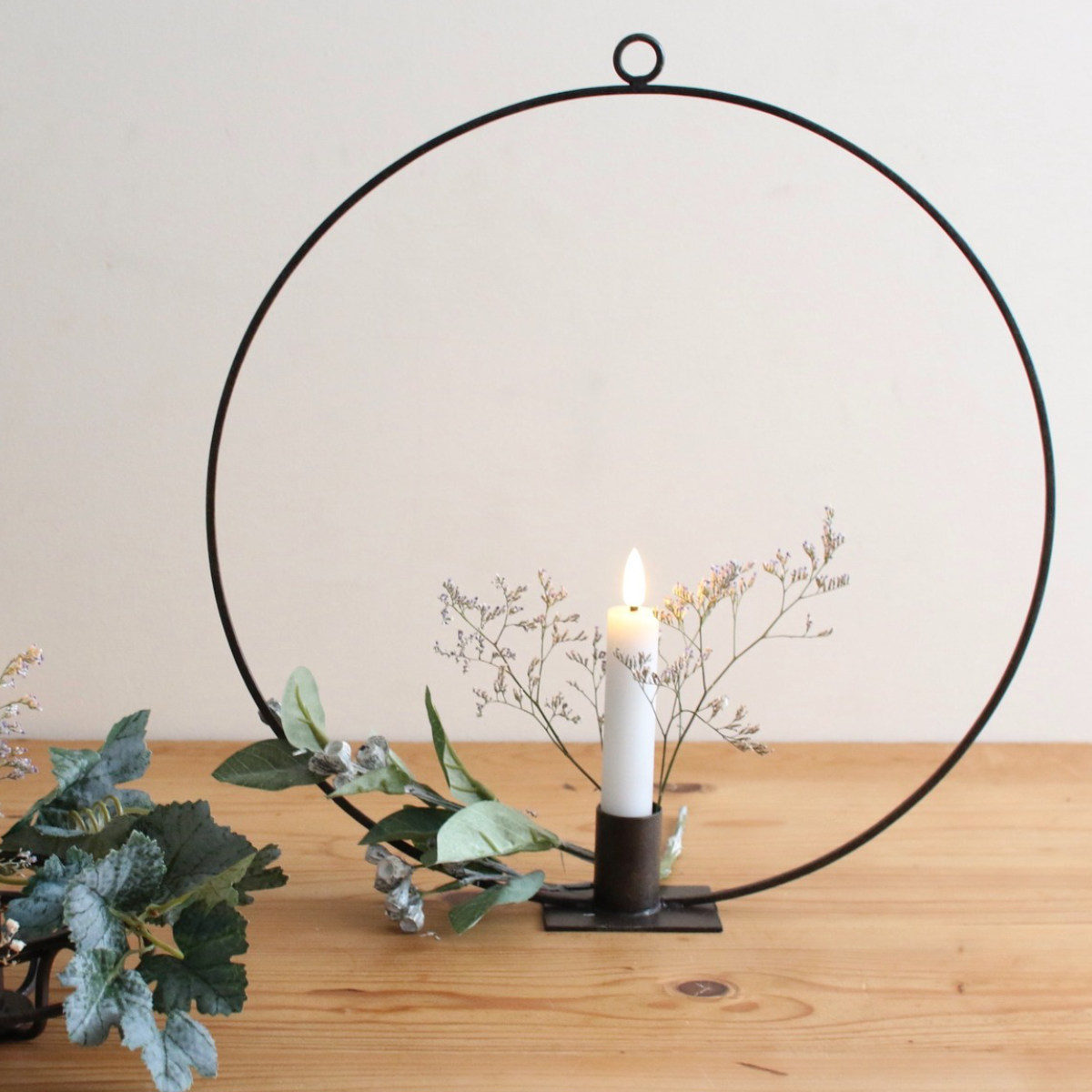 リースを作れるようなリング形で、壁に掛けられる吊り環付きです。キャンドルだけでなく、ドライフラワーなどの組み合わせで華やかになります。