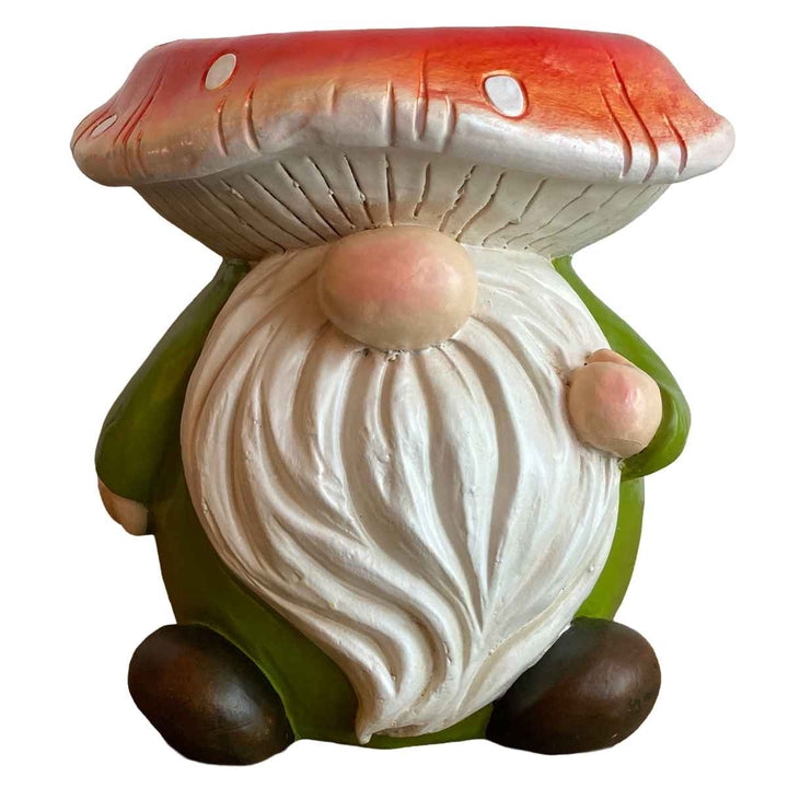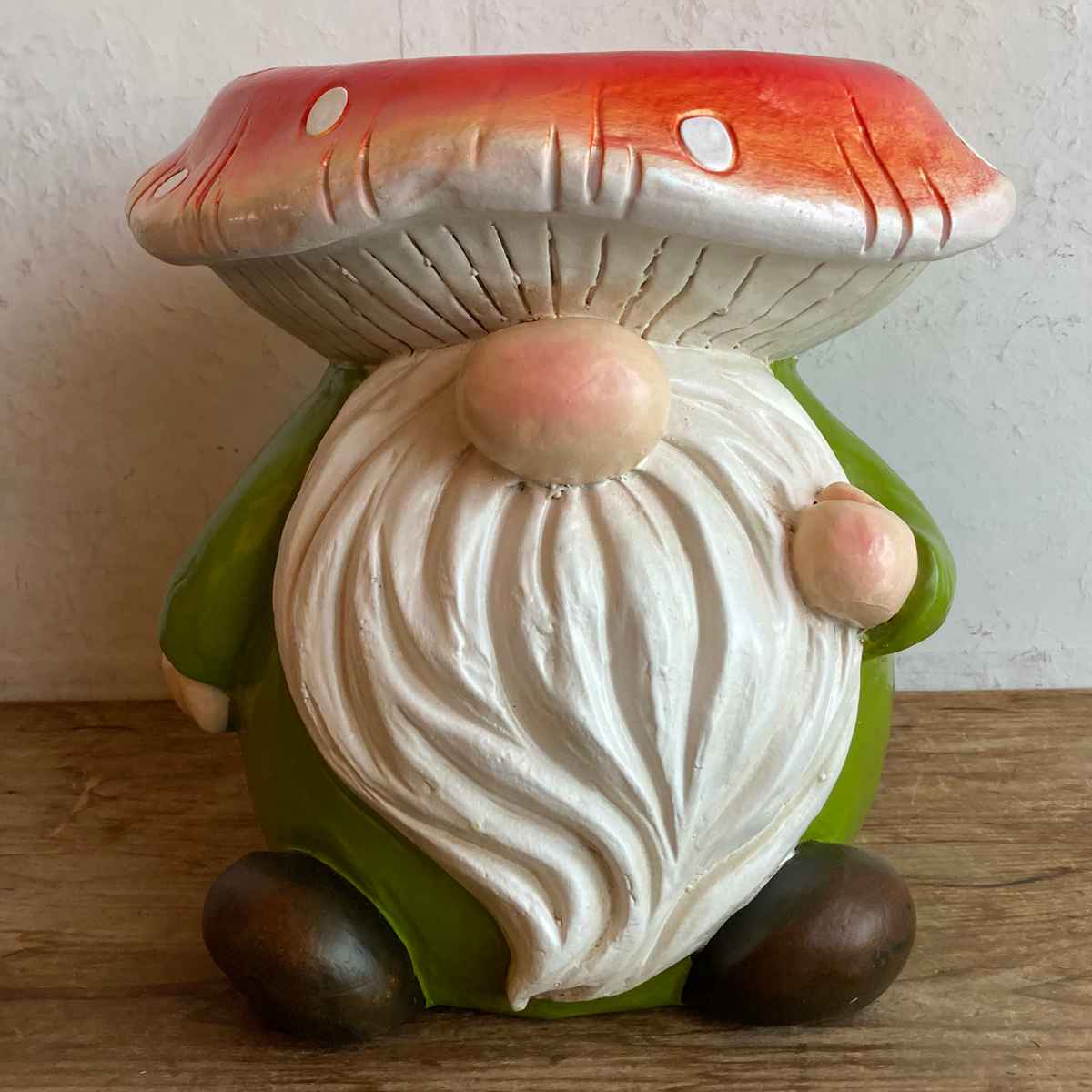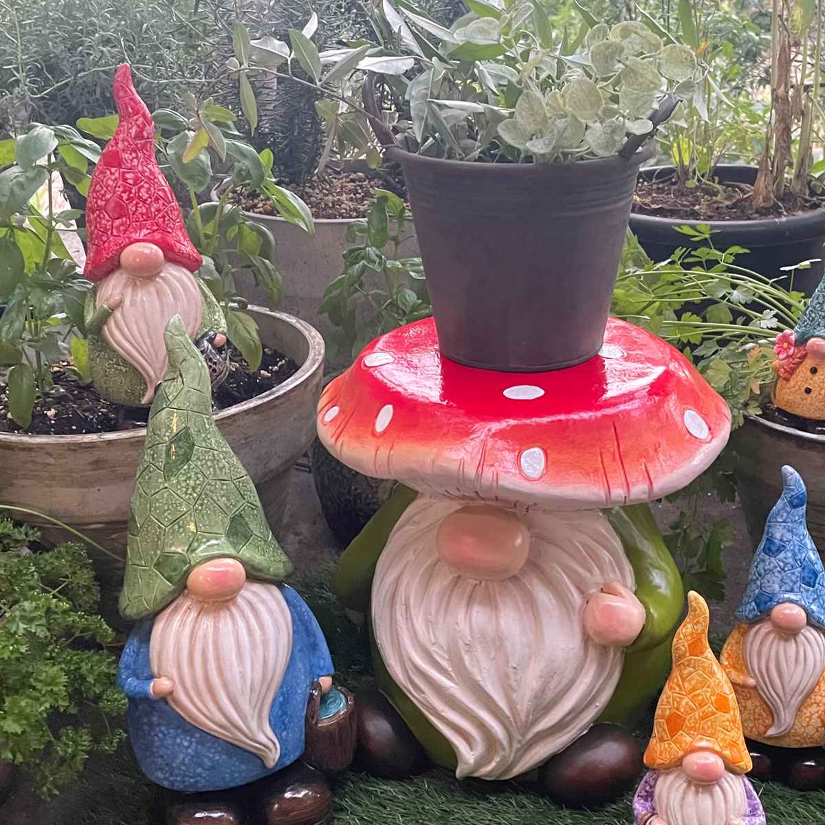 まるで絵本の世界から飛び出してきたような、愛らしいガーデンノームです。カラフルな配色が目に楽しく、置くだけで楽しい空間を演出します。