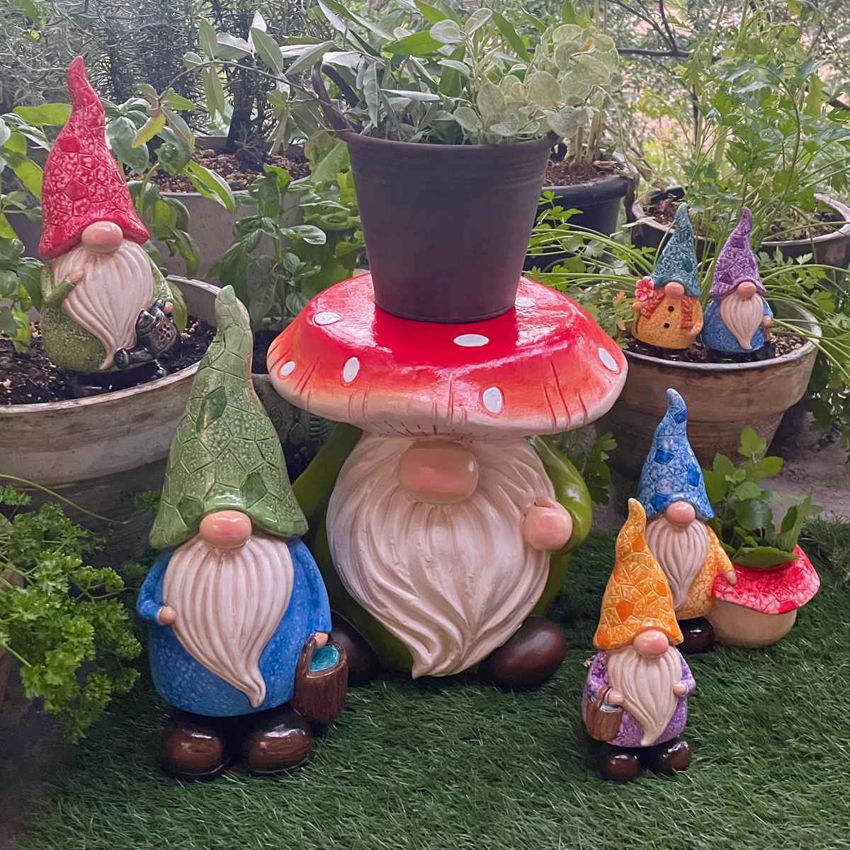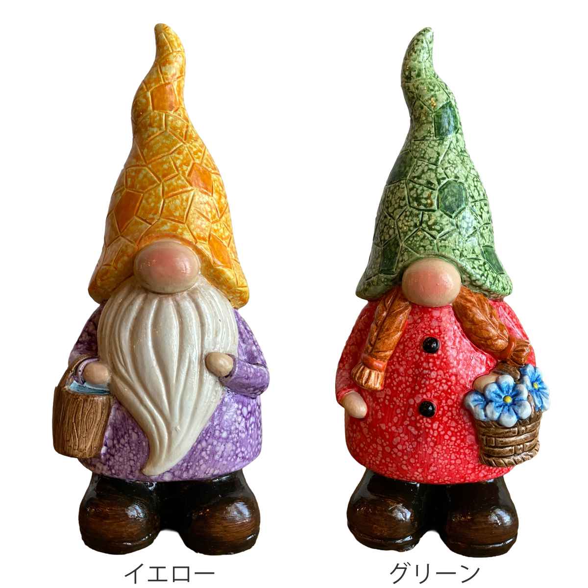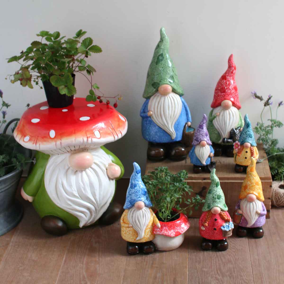 まるで絵本の世界から飛び出してきたような、愛らしいガーデンノームです。カラフルな配色が目に楽しく、置くだけで楽しい空間を演出します。