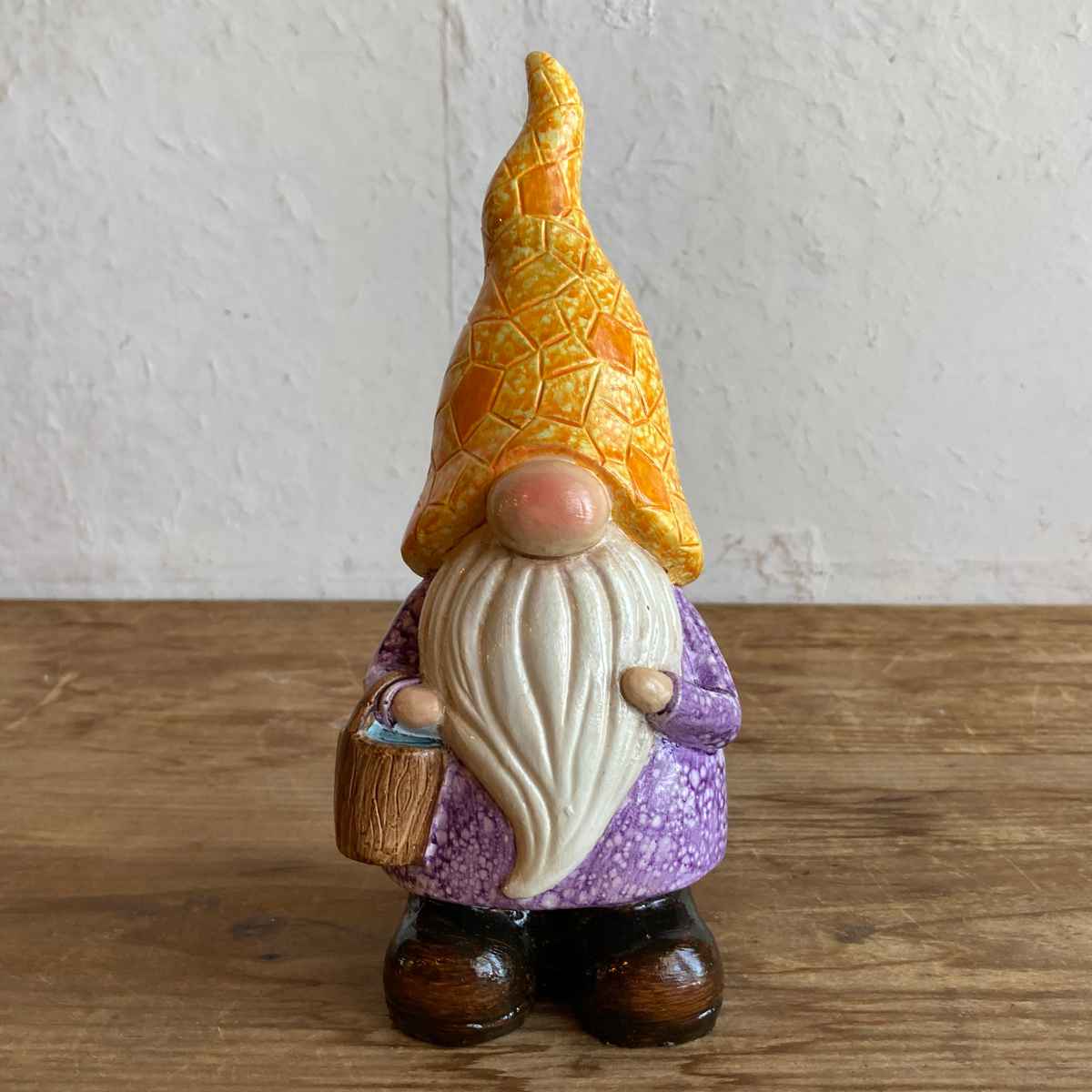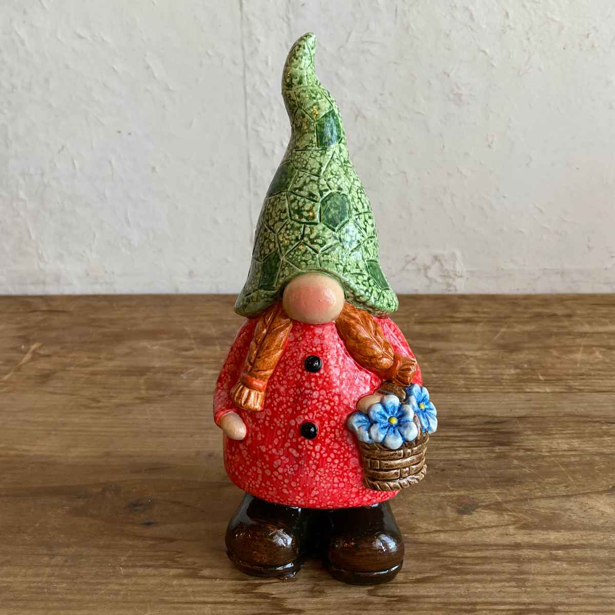 手にカゴを持ったキュートな姿のガーデンノームです。花をカゴいっぱいに摘んでおでかけを楽しんでいる様子に癒されます。