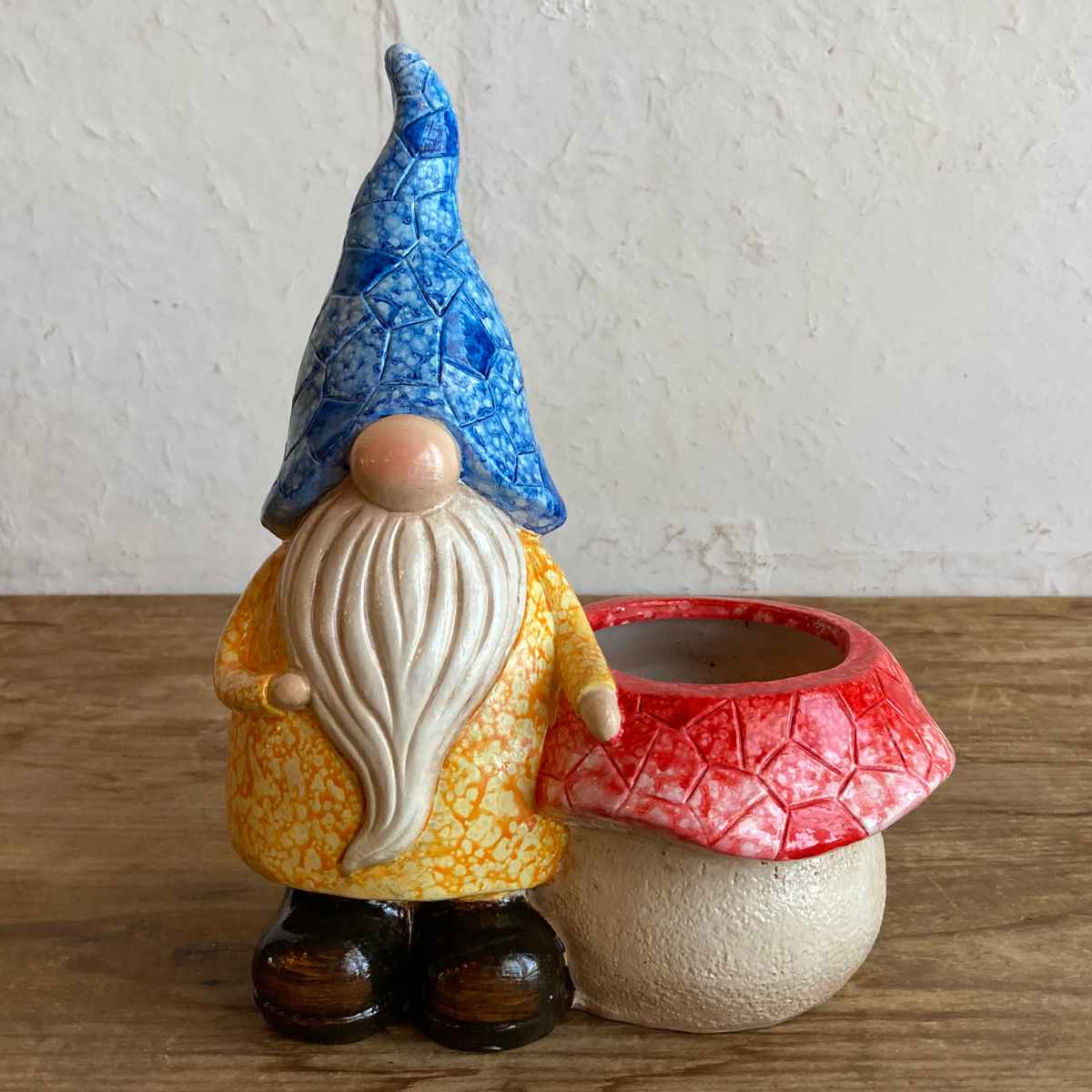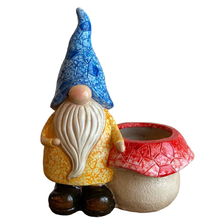キノコをかたどった可愛いポット付きのガーデンノームです。ポット部分は小さな鉢植えとしても、小物入れとしても使用できます。