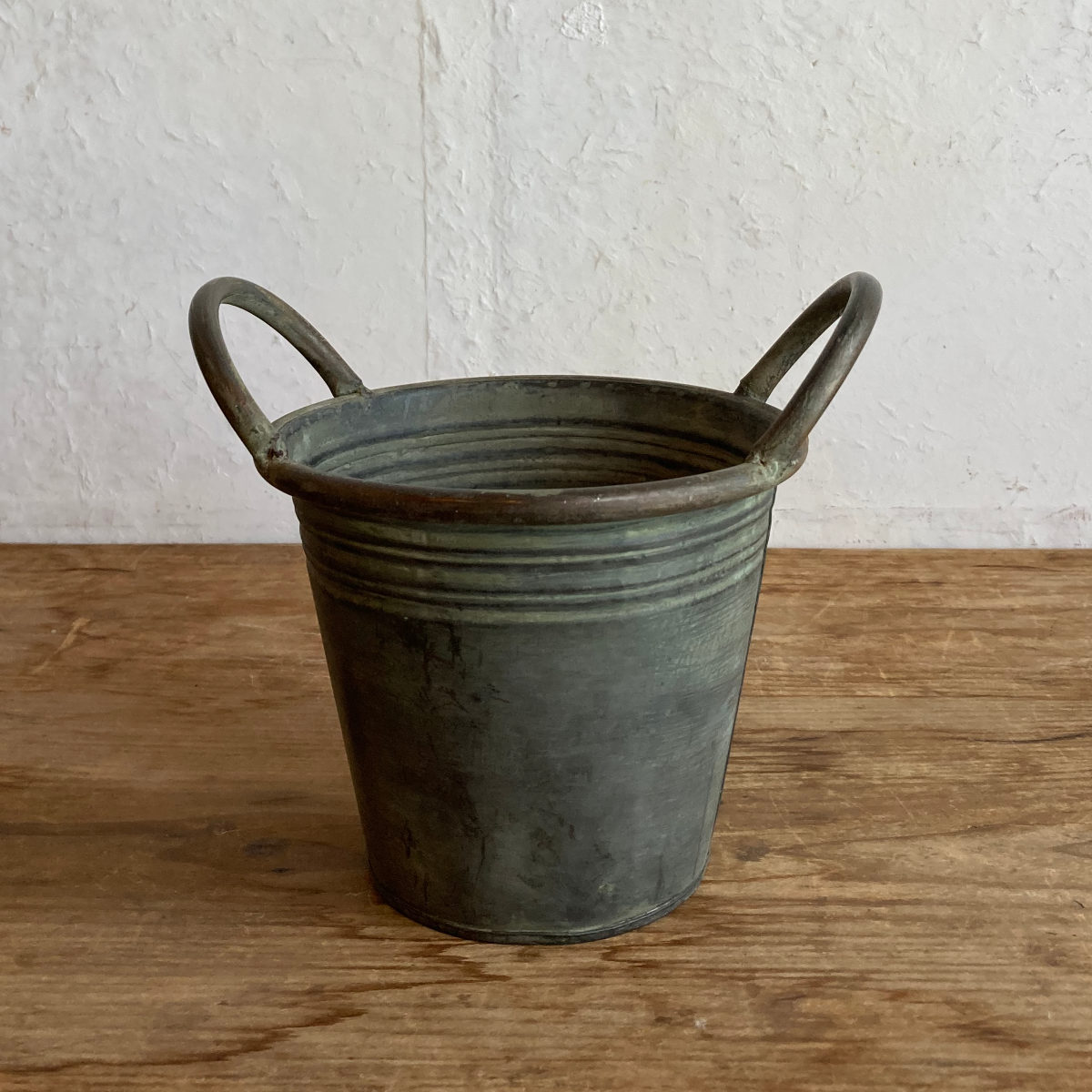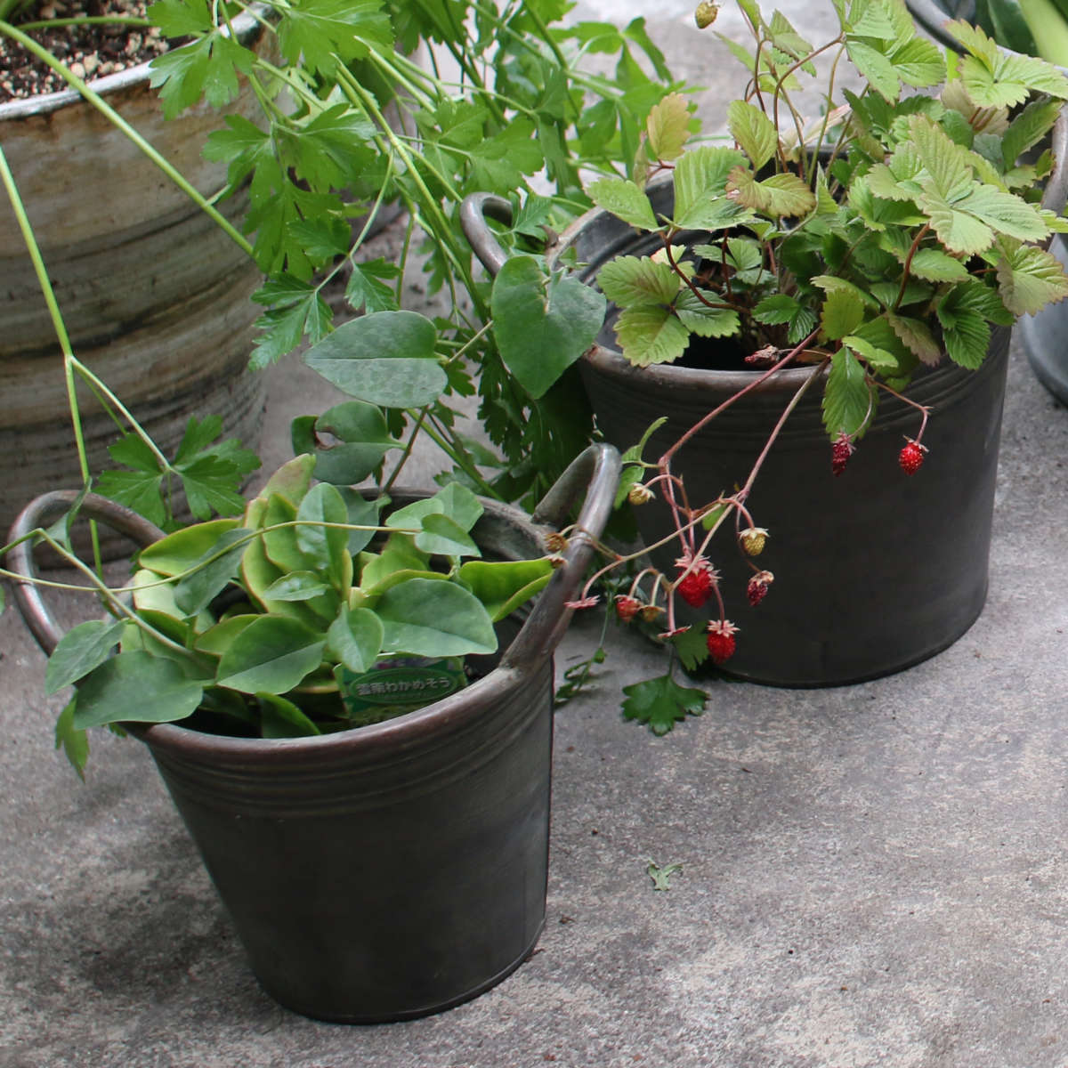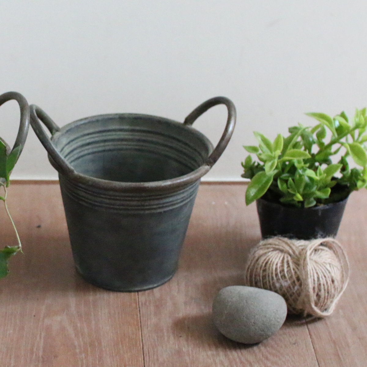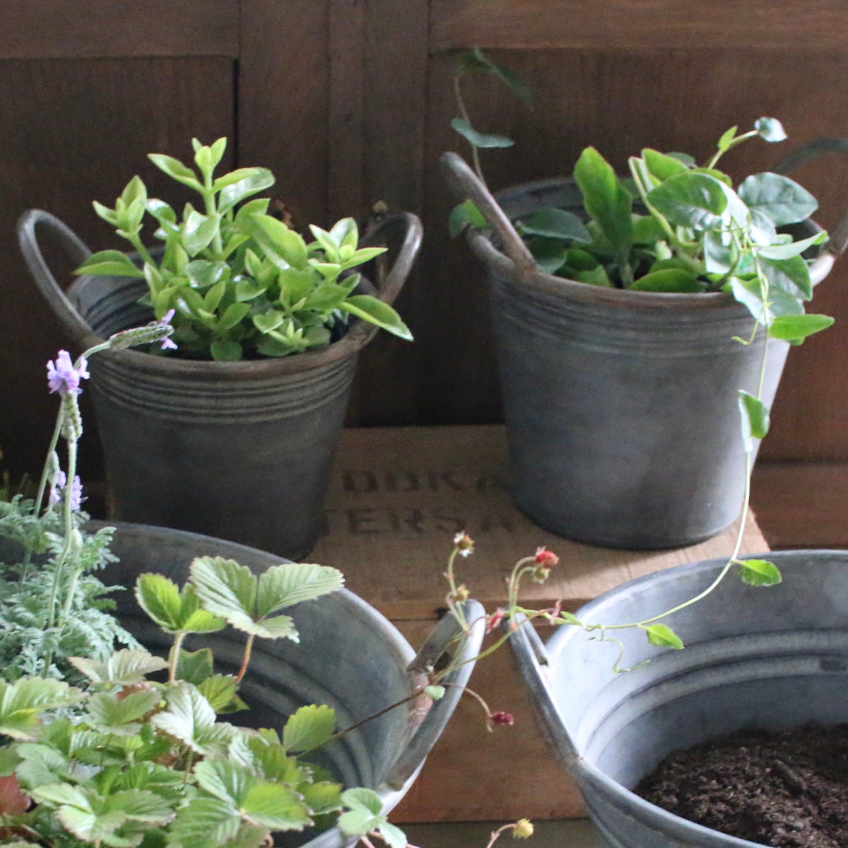 ナチュラルで素朴な風合いが魅力のブリキハンドルポット。グリーンやハーブの寄せ植えにぴったりです。