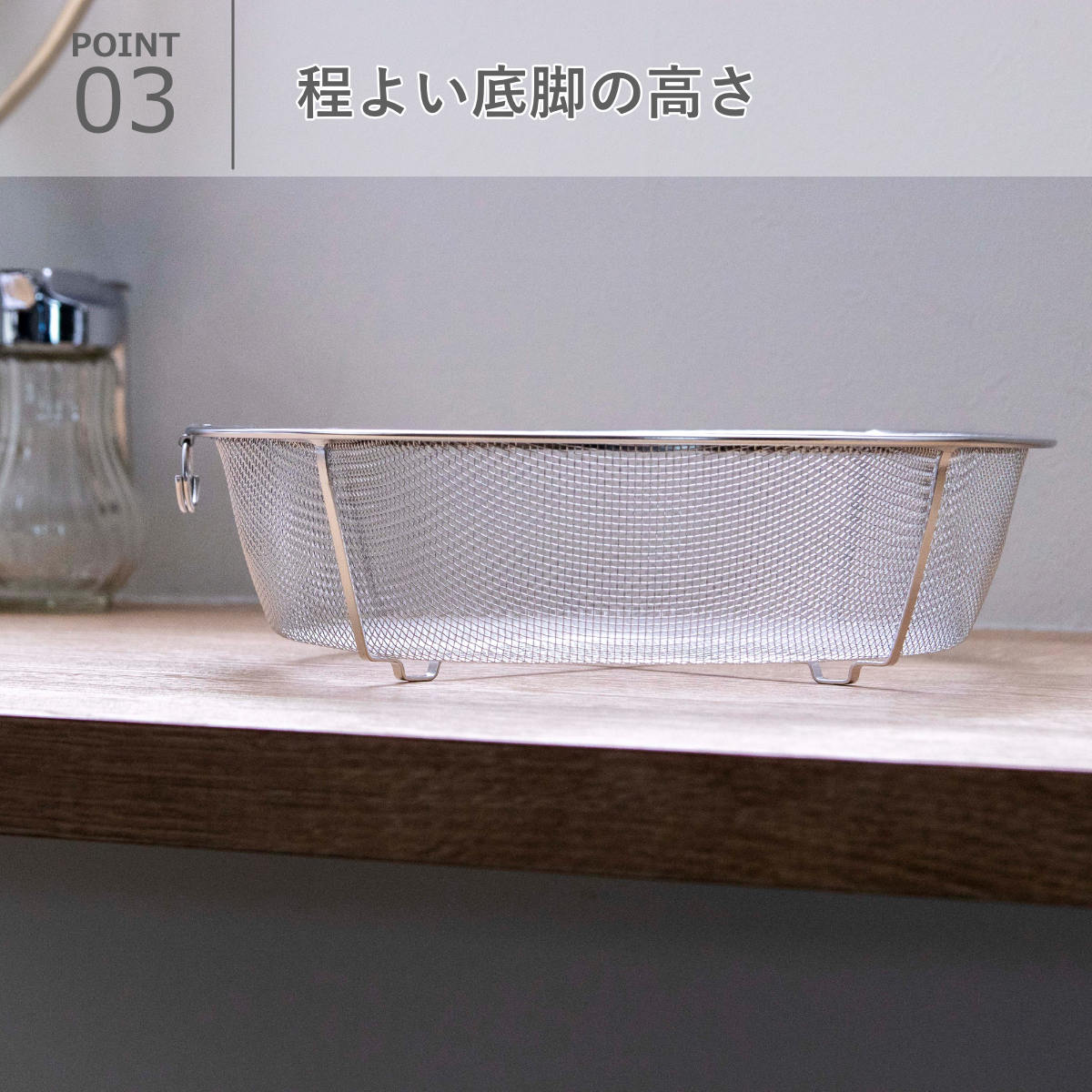 底面に足が付いているので、シンクに直置きしても底がつかず衛生的にお使いいただけます。底が上がっていることで、通気性も良く乾きやすいです。