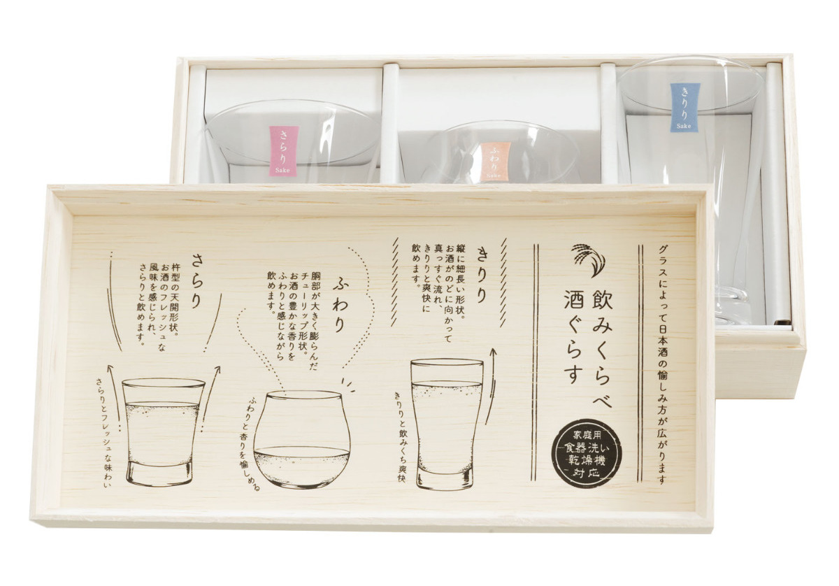 グラスによって日本酒の味わいや風味の違いが愉しめるギフト3点セットです。お酒の個性を引き出す「さらり 140ml」「ふわり 230ml」「きりり 135ml」の3タイプのグラスです。日本酒を半合(90ml)入れるのに適しています。