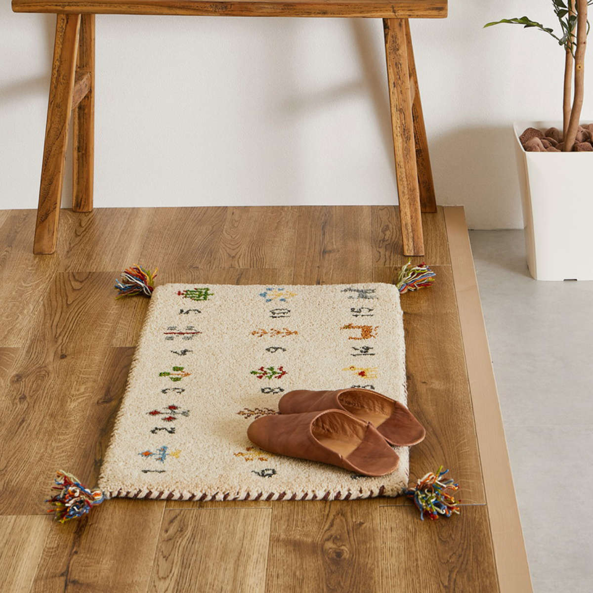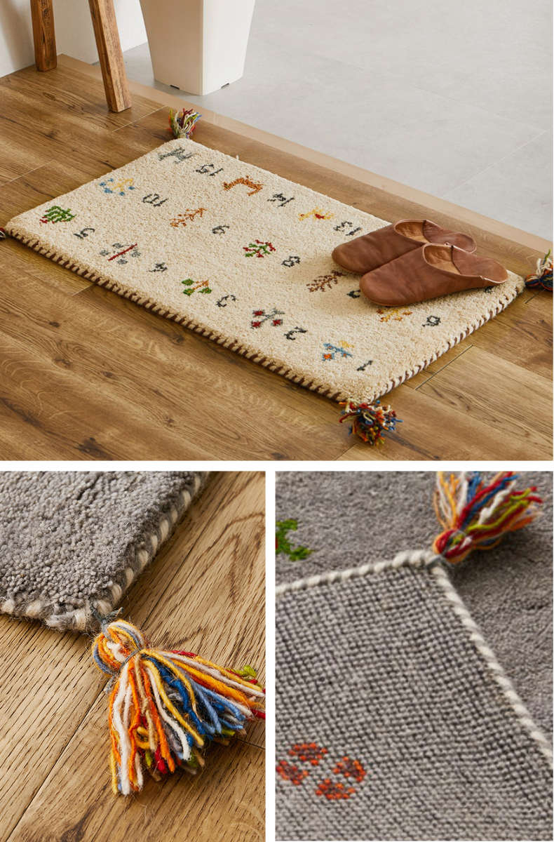 しっかりとした密度と厚みで、ふかふかな踏み心地をお楽しみいただける玄関マットです。ギャッベ模様特有の遊牧民の素朴であたたかなモチーフが、お部屋を温もりのある空間に演出します。