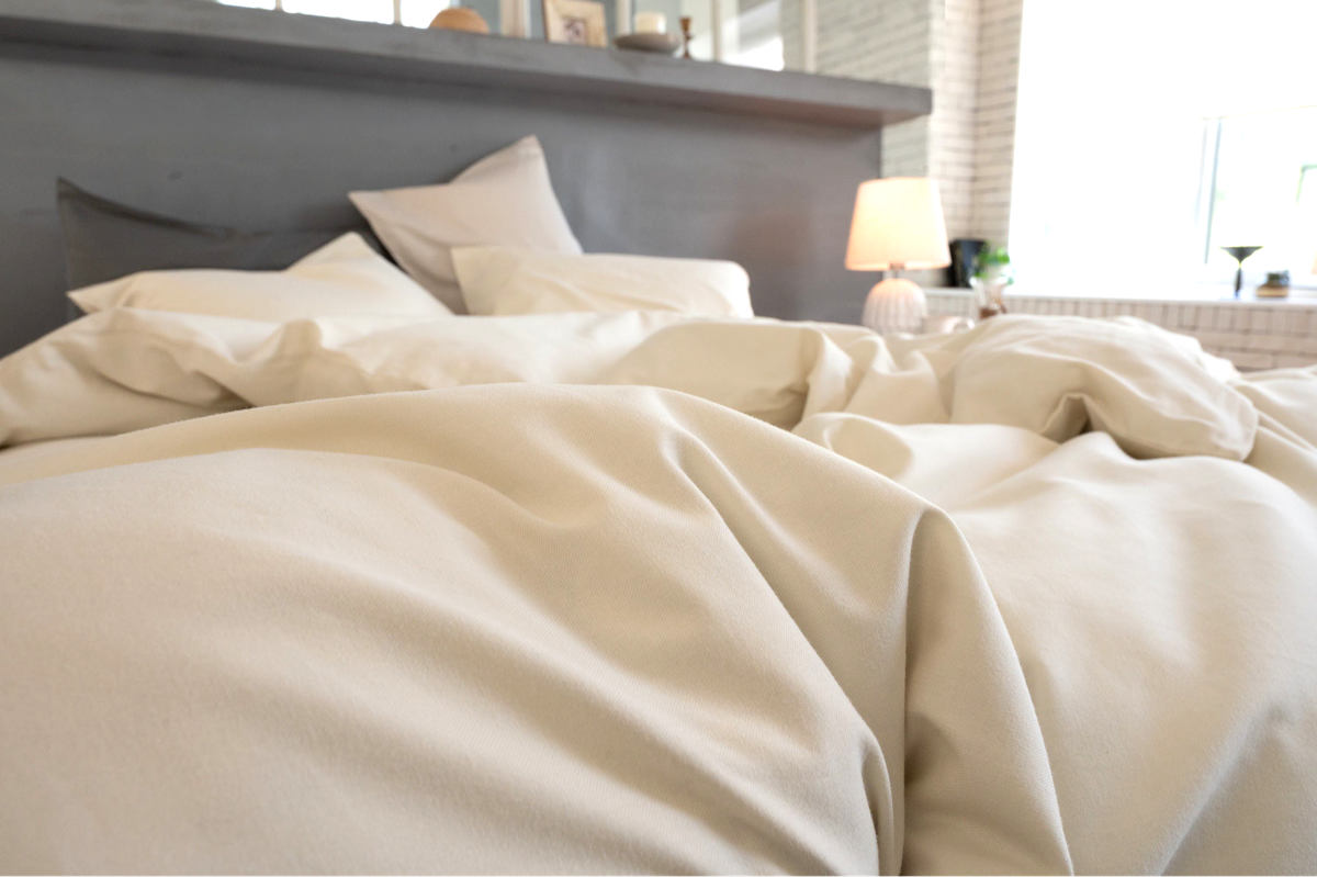 天然素材コットン100%の糸を、ツイルに織り上げほんのり微起毛に仕上げた掛け布団カバーです。適度にハリを残し、肌に触れる毛が心地よいと感じるくらいの繊細でなめらかな起毛具合です。思わず顔をうずめたくなるような、やさしく包み込まれる心地よい肌ざわりです。