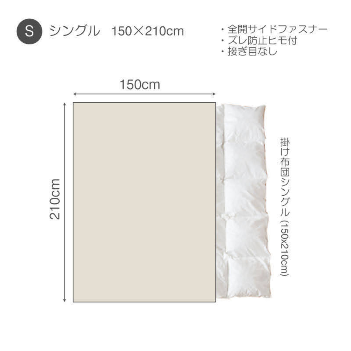 片側に全開するサイドファスナーが付いているので、布団の出し入れが簡単にできます。見返し付きで、ファスナーが直接肌に触れにくい仕様です。