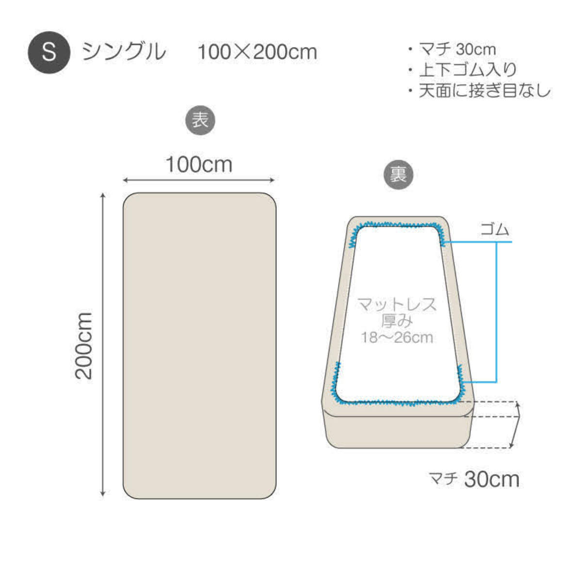 マットレスの四隅をすっぽり包み込むように、あらかじめマチを30cm取ったシーツです。厚さ18~26cmのマットレスに対応しています。