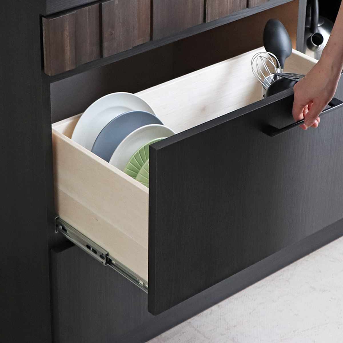 全ての引出しにスライドレールを採用。軽い力でスムーズに開閉でき、奥までしっかり見渡せます。深さの違う引出しで整理しやすく、たっぷりと収納することができます。