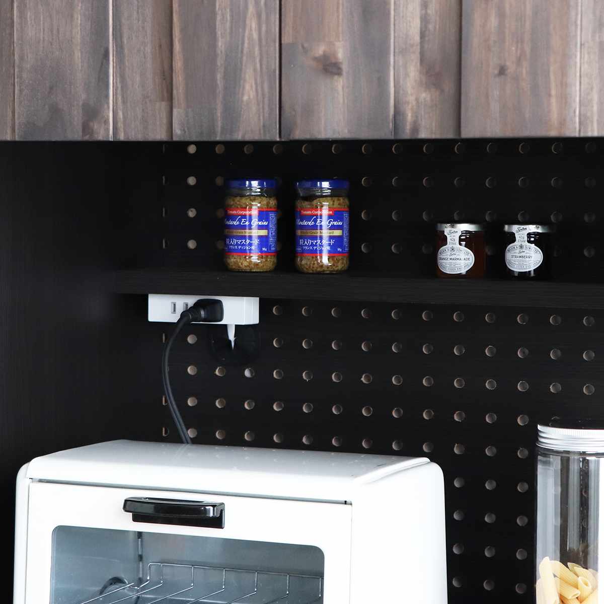 湿気や蒸気を逃がすために背板には有孔ボードを使用しています。上部には、グラスや調味料を置いておける固定棚付き。お気に入りを飾るディスプレイスペースとしてもお使いいただけます。
