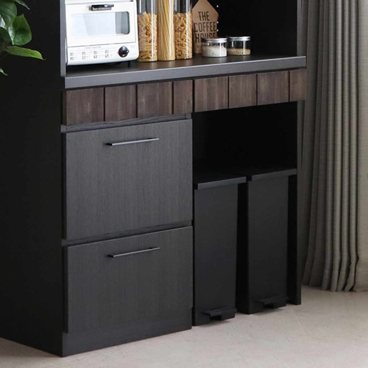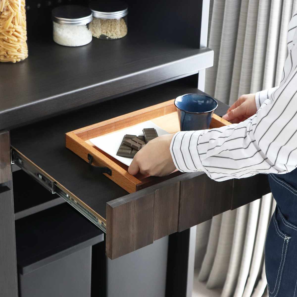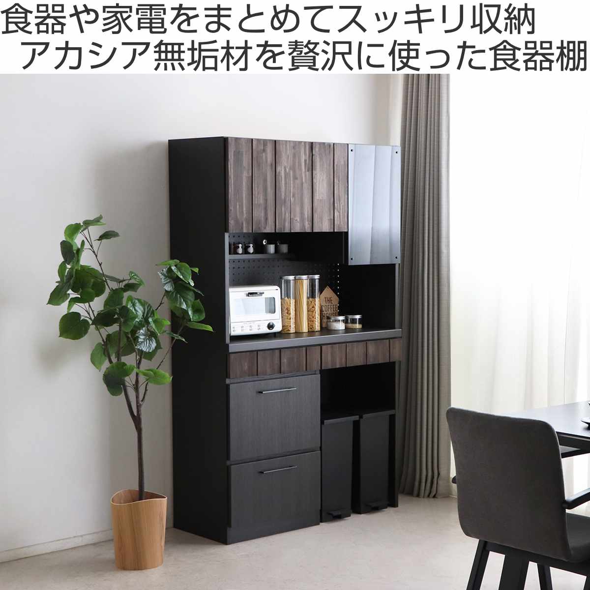 高級感あふれるアカシア無垢材をふんだんに使用した、上質なデザインの食器棚です。天然木の豊かな表情にモダンなブラックを合わせ、洗練された空間を演出します。食器や調理器具、家電をすっきりと収納でき、デザイン性と機能性を兼ね備えた一台です。