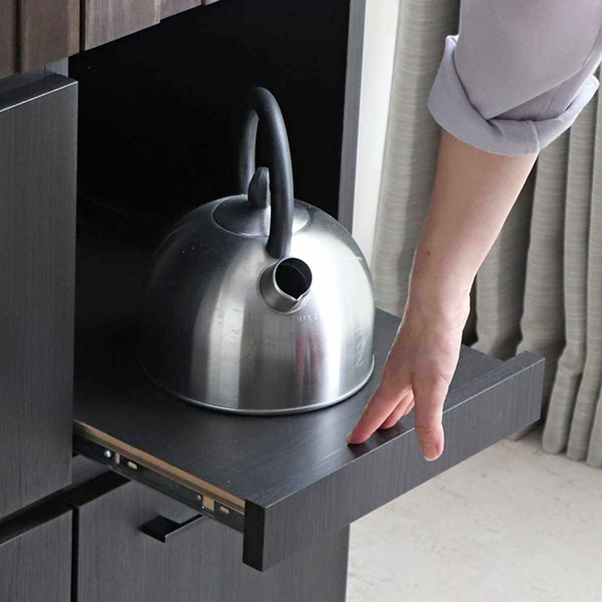 炊飯器や電気ポットなど、使う時だけサッと手前にスライドして使用することができます。背板に通気穴があるので、熱や蒸気がこもる心配がありません。