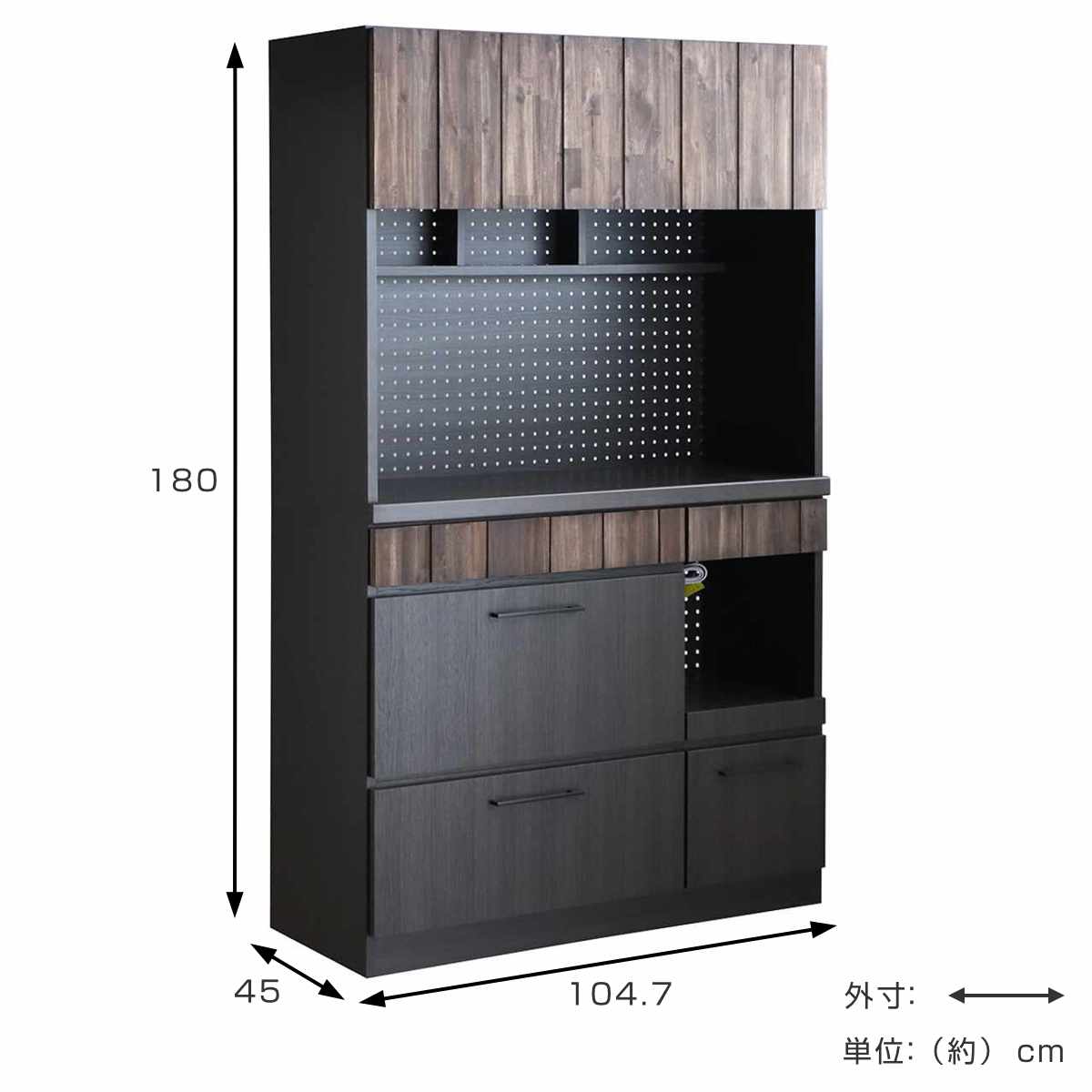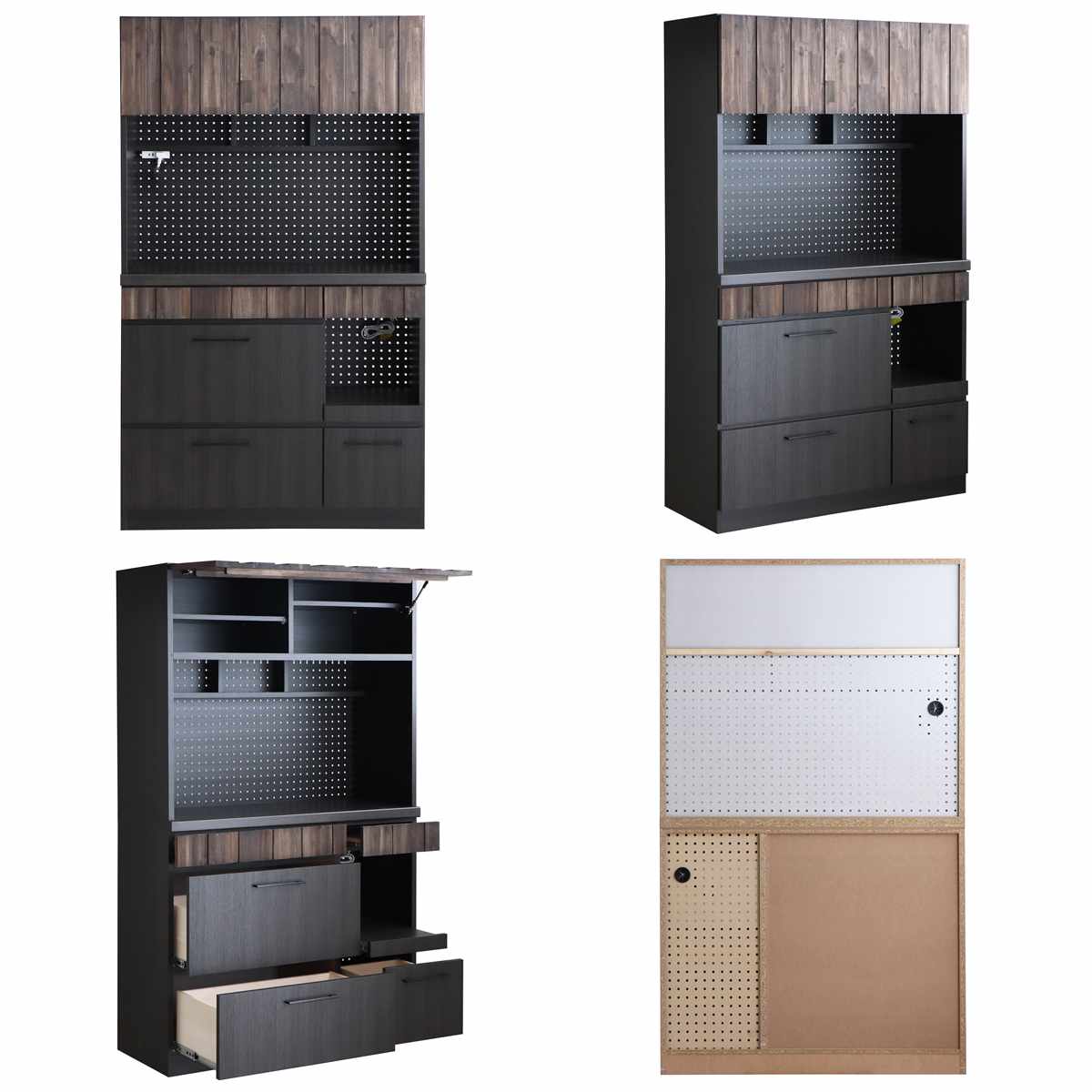 湿気や蒸気を逃がすために背板には有孔ボードを使用しています。上部には、グラスや調味料を置いておける固定棚付き。お気に入りを飾るディスプレイスペースとしてもお使いいただけます。