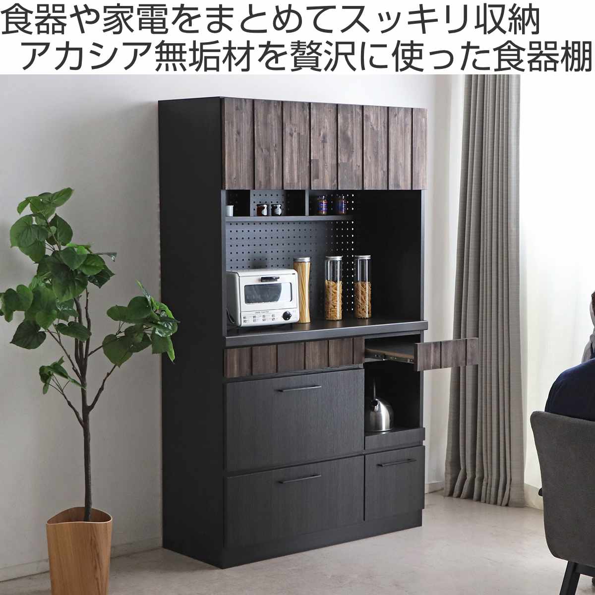 高級感あふれるアカシア無垢材をふんだんに使用した、上質なデザインの食器棚です。天然木の豊かな表情にモダンなブラックを合わせ、洗練された空間を演出します。食器や調理器具、家電をすっきりと収納でき、デザイン性と機能性を兼ね備えた一台です。