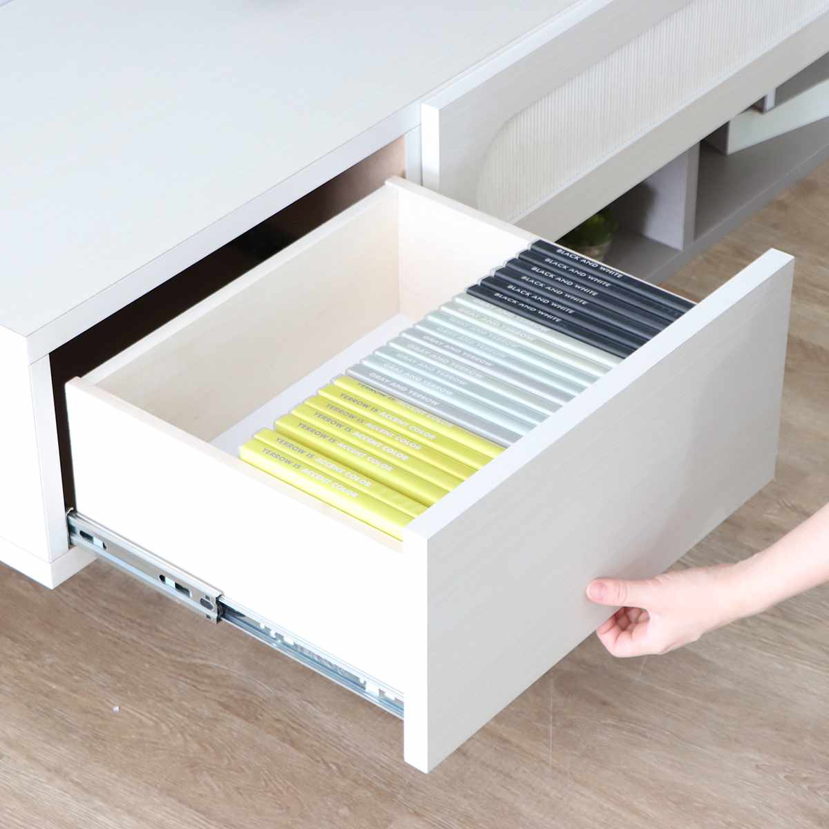 リビング周りの小物やDVDケースの収納に最適な深さの引出しは、フルスライドレール仕様で奥までしっかりと見渡せます。DVDなどをたっぷり収納しても、スムーズに開閉ができます。