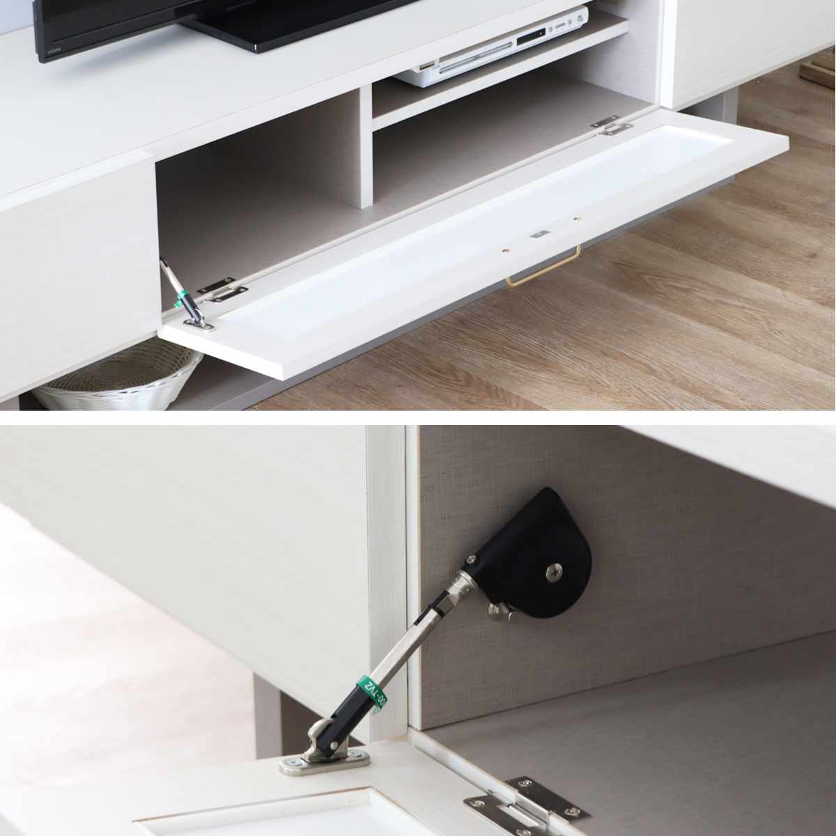扉が広範囲に開くので、物の出し入れがしやすいフラップ扉。ゆっくり閉まるソフトダウンステーを使用しているので、開閉音が気になりません。