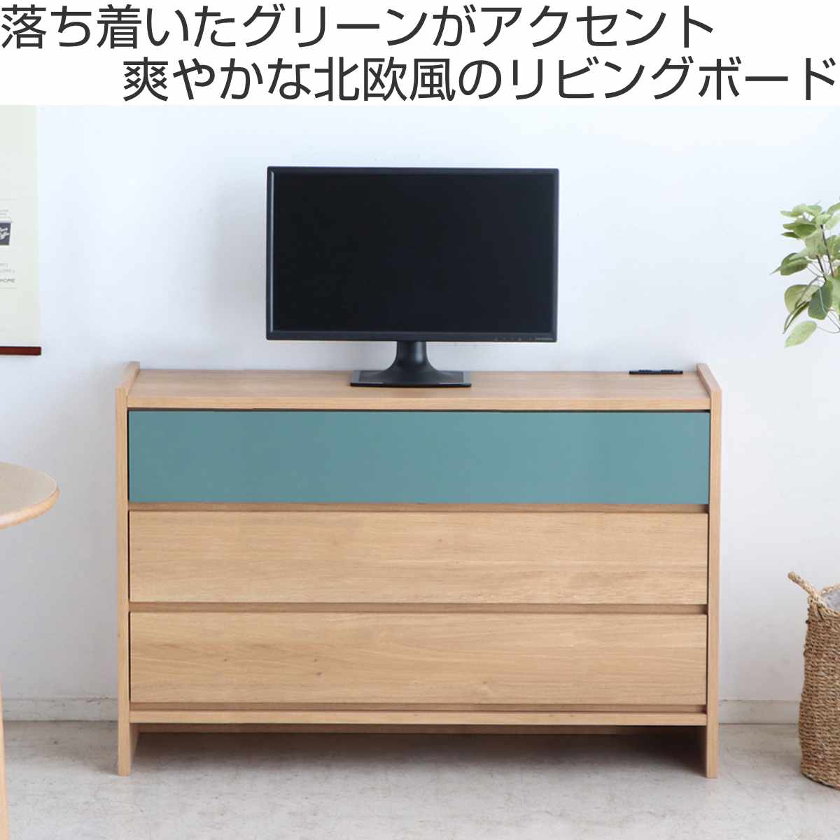 落ち着いたグリーンが目を引くリビングボードです。シンプルながら、お部屋のインテリアをそっと引き立てるデザインです。ハイタイプなので、ダイニングや寝室でもテレビが見やすく、テレビ台としてもオススメです。