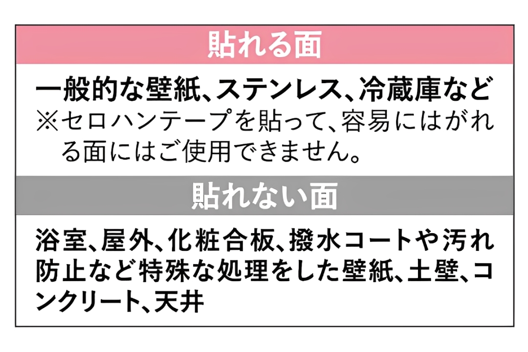 表面が凸凹した一部の面や、特殊な処理をした面、経年劣化、汚れのある面、壁紙の種類によっては十分密着しないことがあります。また、経年劣化していたり、表面が弱い素材は、その一部がはがれる場合があります。